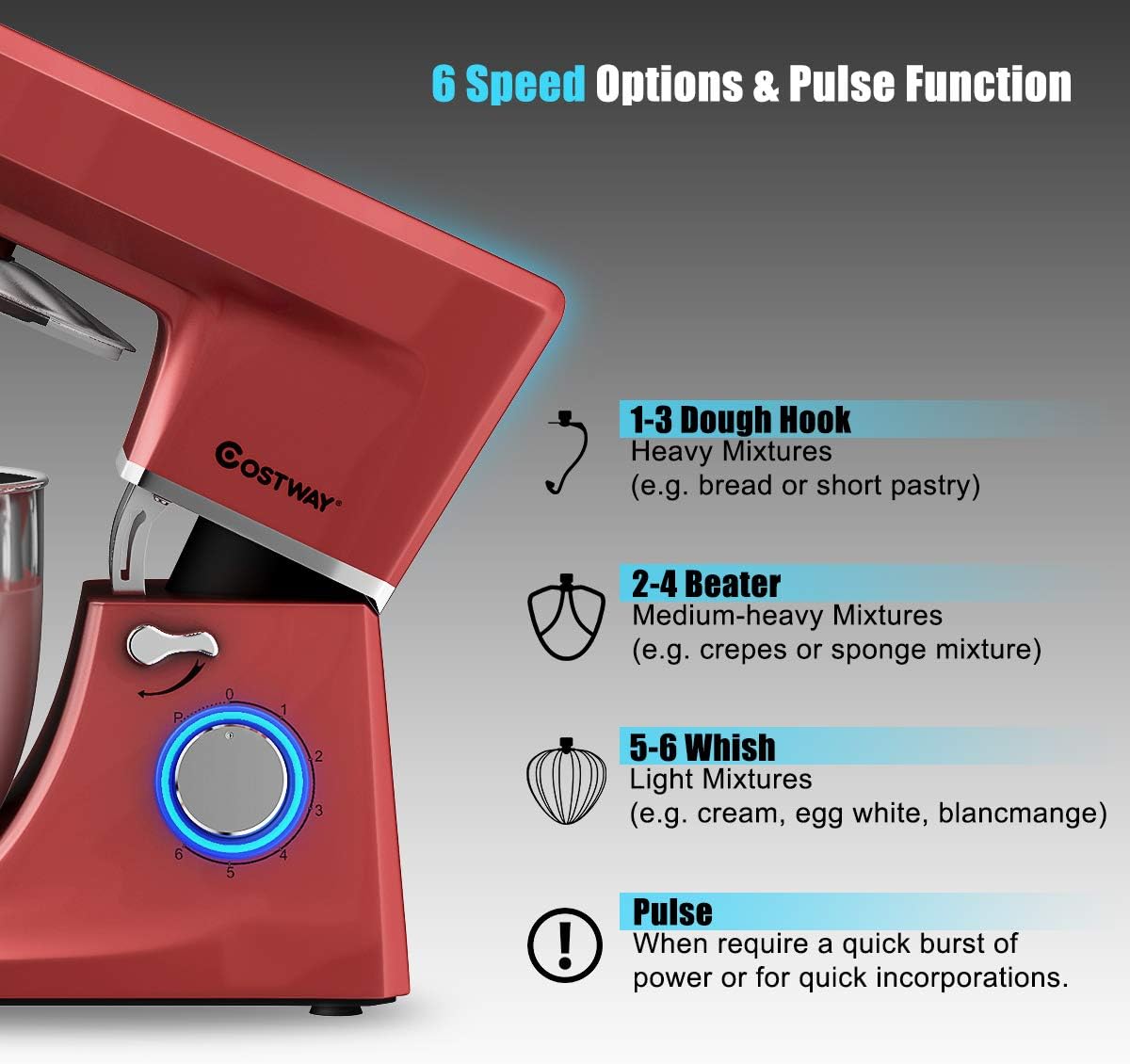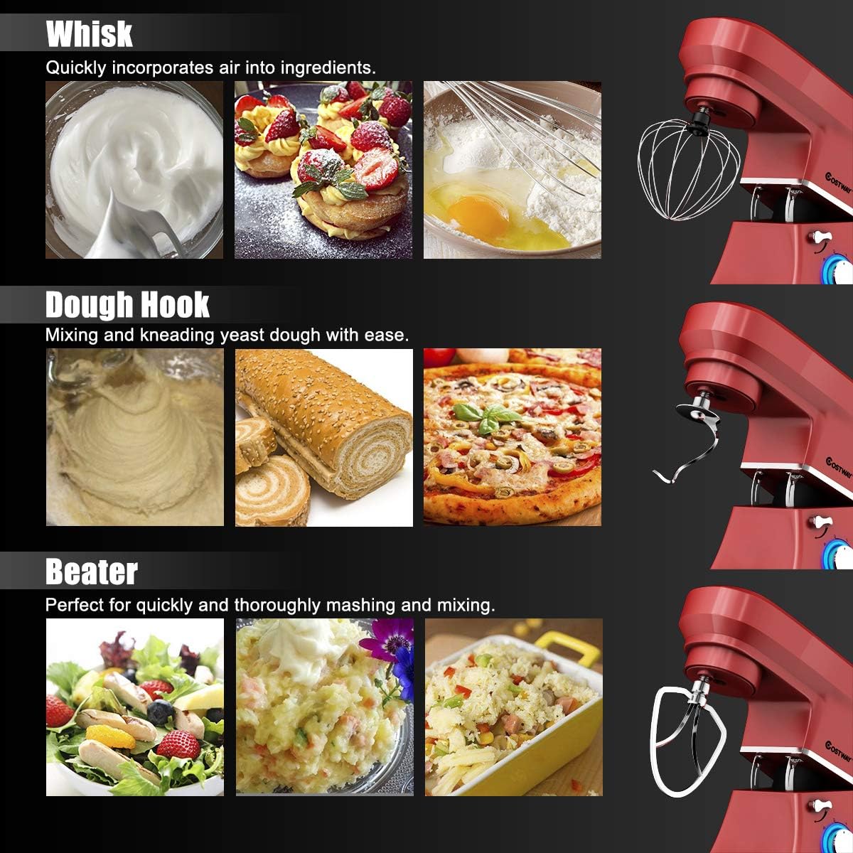- 3 DIFFERENT ATTACHMENTS FOR VERSATILE USAGE------Featured with 3 different attachments( dough hook, beater, whisk), it is perfectly designed for you to do all types of food mixing, including creaming, mixing, beating, whipping, kneading. You can now make a wealth of new recipes, from cakes, cookies, to breads.