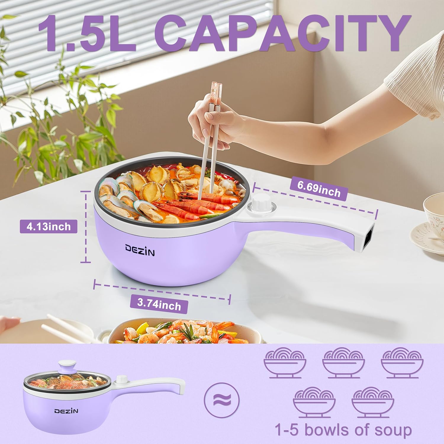 - Small in storage - This Dezin electric cooker, with a capacity of 1.5L (representing its full load capacity when the pot is covered with the lid), is compact in size and easy to store. It is particularly suitable for individuals living in dorms without stoves or those who prefer not to rely on takeout. Moreover, if you are planning a trip or a picnic, this portable pot will be your best companion on the go!