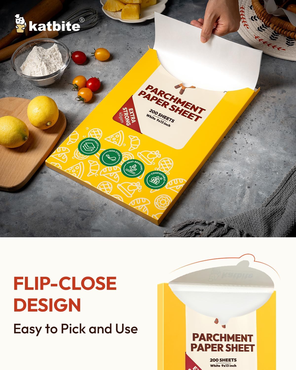 Katbite 200Pcs 9x13 inch Heavy Duty Parchment Paper Sheets, Precut Parchment Paper for Quarter Sheet Pans Liners, Baking Cookies, Bread, Meat, Pizza, Toaster Oven (9"x13")