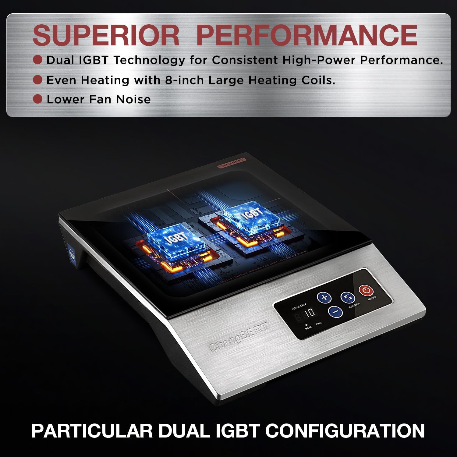 - CONSISTENTLY STABLE HIGH-POWER OUTPUT – Engineered for Demanding Use. ChangBERT’s induction range is built with continuous-duty circuitry and a stable power delivery system to maintain consistent high-wattage output during long cooking sessions. Its internal thermal management reduces component heat and lowers fan noise—ensuring reliable performance during extended service hours and high-volume prep work.