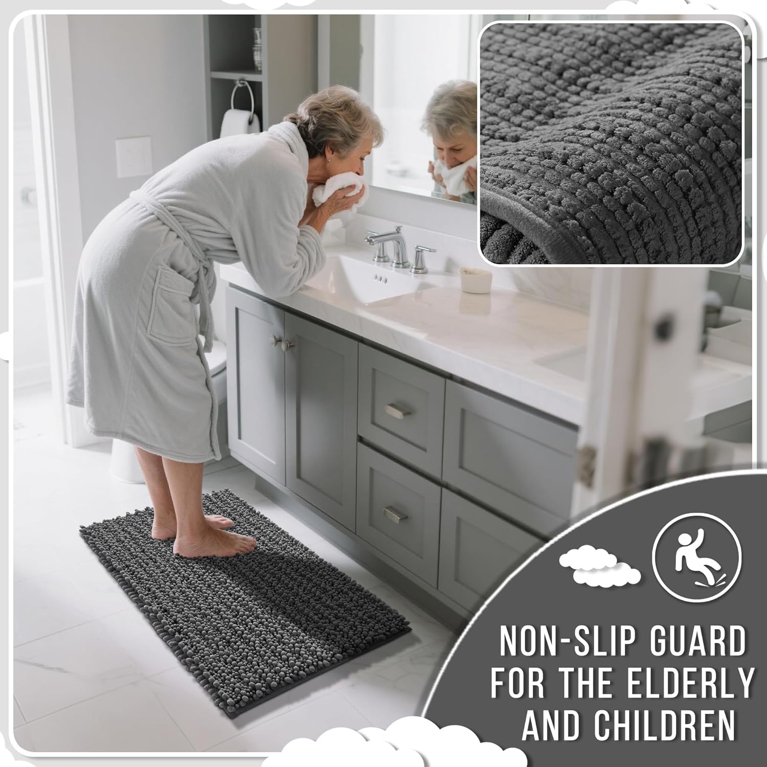 - Ultimate Cloud-Like Soft Comfort: Experience walking on clouds with our extra thick chenille bathroom mat! The ultra plush high pile density cradles your feet, banishing cold tiles after showers. It is perfect for adding warmth to any bathroom floor, transforming routine steps into luxury moments