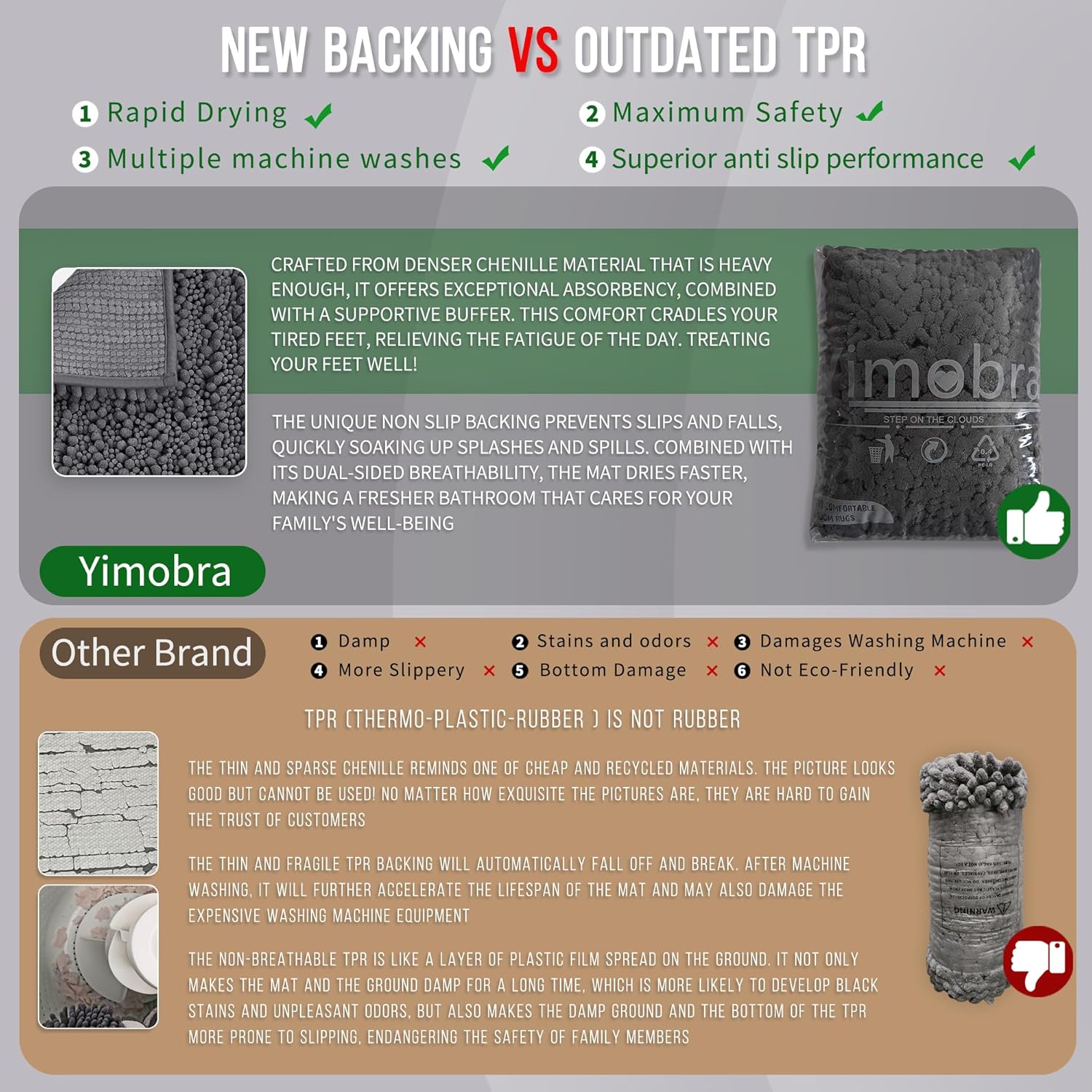 - Total Grip Safety & Quick Dry: Yimobra bath rug features a feather-light yet ultra-grippy hot-melt backing that stays firmly in place on wet surfaces. Its vertical air-channel chenille fibers ensure rapid and complete dryness, providing instant dry safety the moment you step out of the shower. The product is tested for harmful substances, performance, longevity, and emissions in accordance with the OEKO-TEX Standard 100