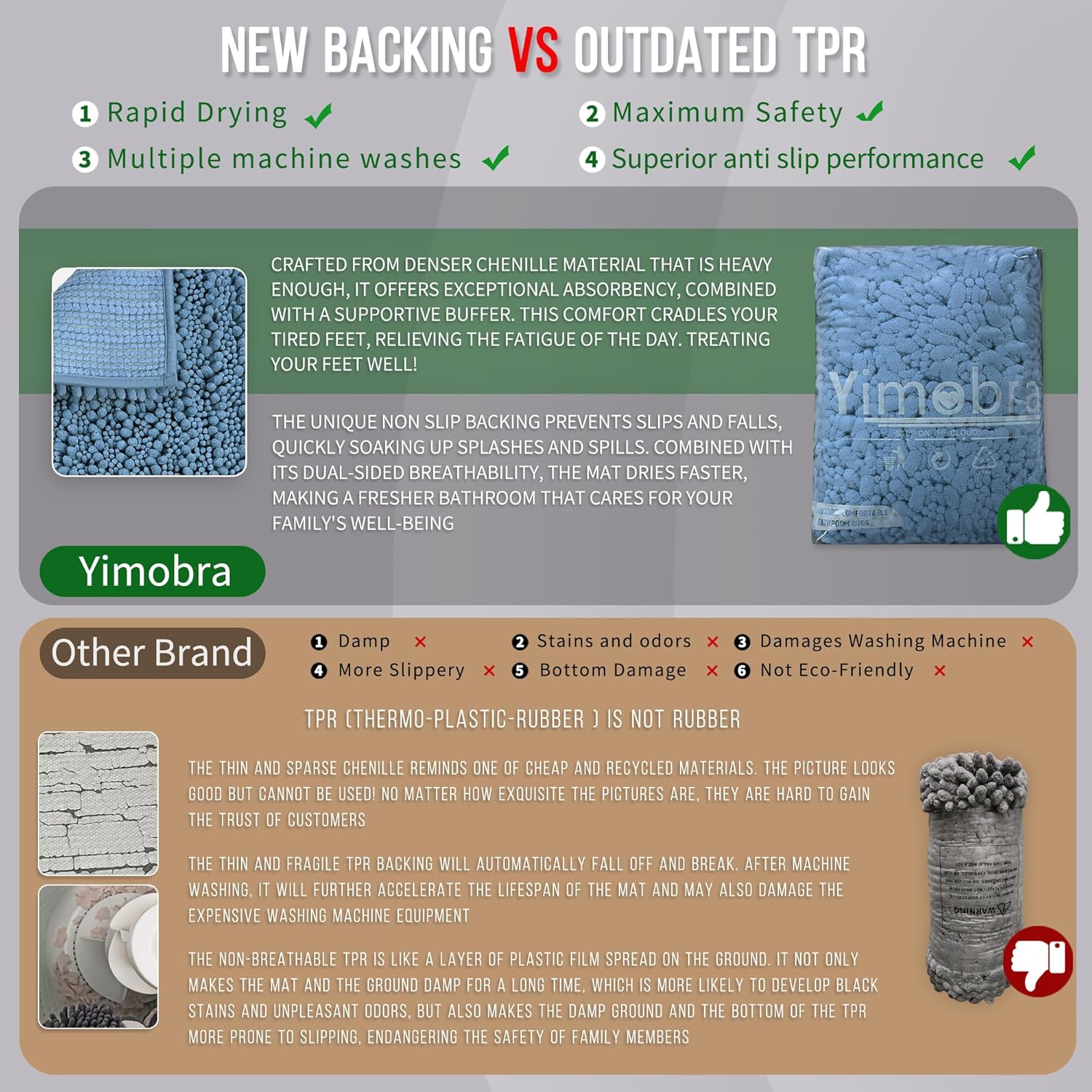 - Total Grip Safety & Quick Dry: Yimobra bath rug features a feather-light yet ultra-grippy hot-melt backing that stays firmly in place on wet surfaces. Its vertical air-channel chenille fibers ensure rapid and complete dryness, providing instant dry safety the moment you step out of the shower. The product is tested for harmful substances, performance, longevity, and emissions in accordance with the OEKO-TEX Standard 100