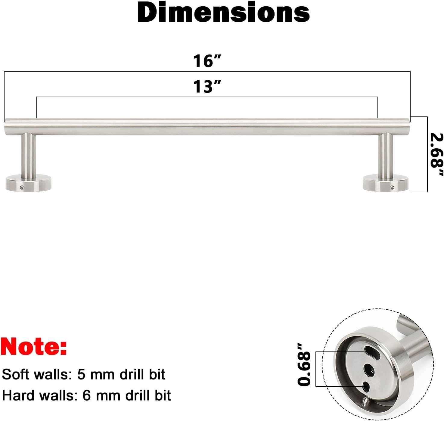 - DIMENSIONS & USE: Overall length is 16" (405mm). The length of hanging space is13" (340mm). 22-Lbs (10kgs) max weight capacity. You can mount this towel bar to either side of your cabinet or closet door for storing at-use hand and dish towels. It can also be used with S hooks, hanging bath balls, hair dryers, tea cups, spoons, clips, etc.