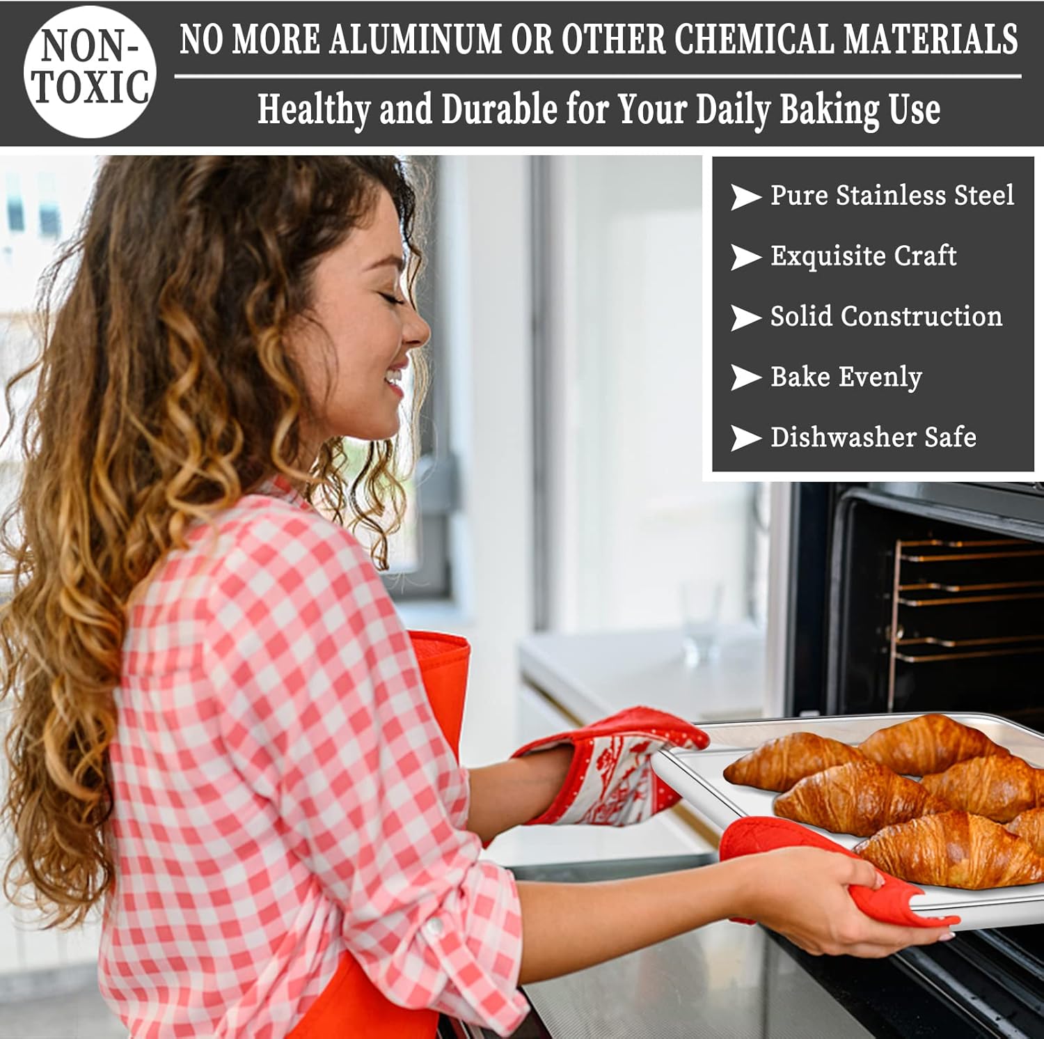 - 🍍 [ENJOY HEALTHY BAKING] Deedro baking sheets and baking racks are constructed with pure stainless steel without any toxic substance or chemical coating, PTFE, PFOA, BPA and rust free. You needn't worry about coating flaking off or noxious material leaching into your food, great substitution of aluminum pan, healthy and safe for daily use.