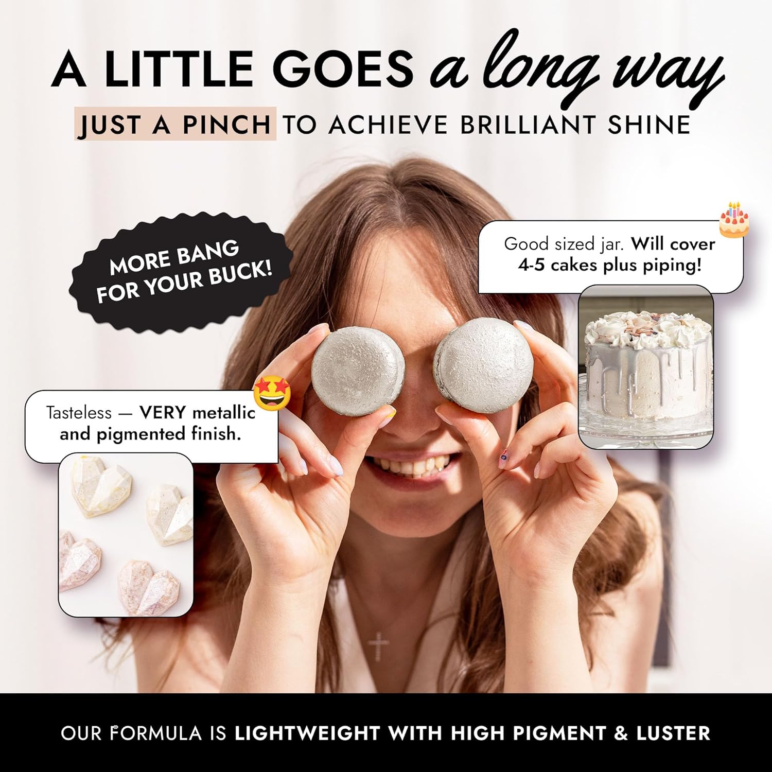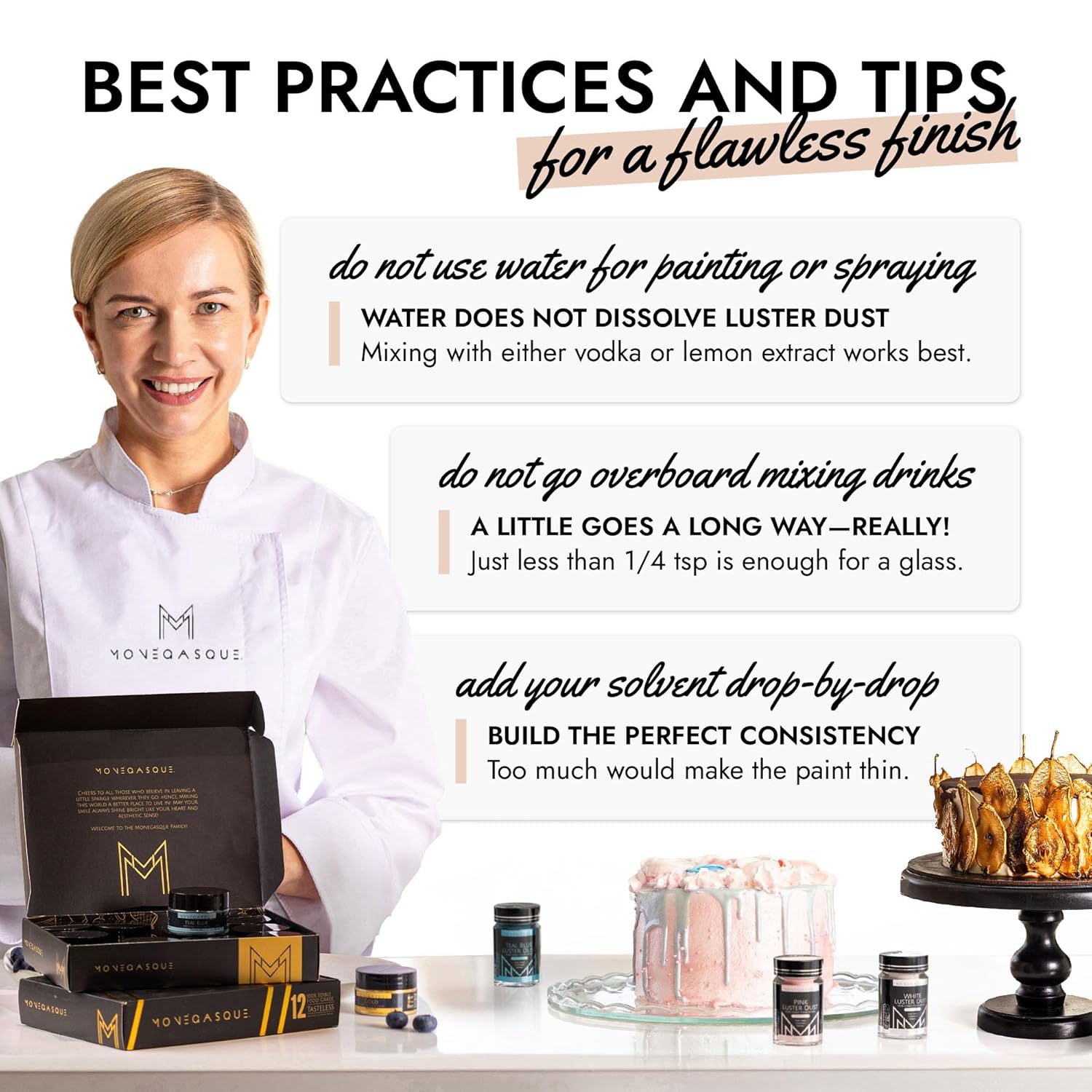 - EASY TO USE: Our white luster dust is incredibly versatile. Apply with a wet brush, airbrush, or dry brush, and even mix into beverages. Achieve professional-looking results effortlessly at home, whether decorating halloween cakes or adding shimmer to cocktails.