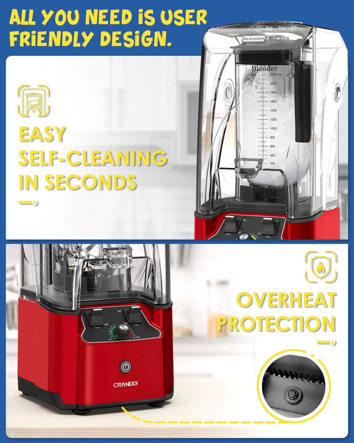 - 2200W POWERFUL MOTOR - CRANDDI K90 motor produces 3HP max 2200 watt of power, 38,000 RPM can even turn ice cubes into snowflakes. The 6-leaf 3D blades assembly and dual direction technology create a vortex blending effect. Built-in pulse and automatic shut off smart technology. 15-speeds control
