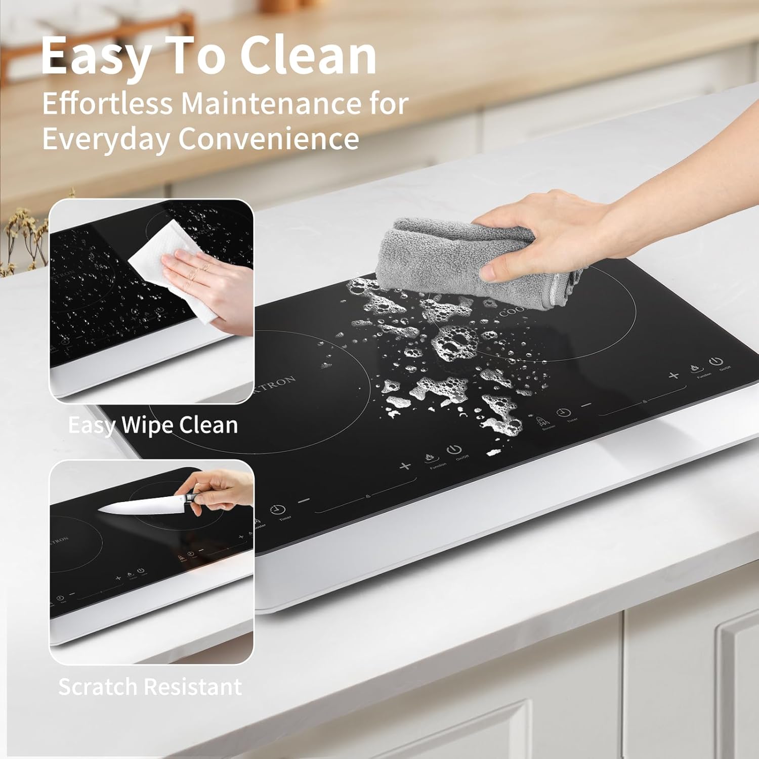 - 【Safe and Easy to Clean】Safety features include a child lock, overheat protection, and an LED display showing “H” when the surface is hot, ensuring worry-free use. The smooth, durable surface is scratch-resistant and easy to clean with a damp cloth, making this two burner induction cooktop both safe and convenient for daily use.
