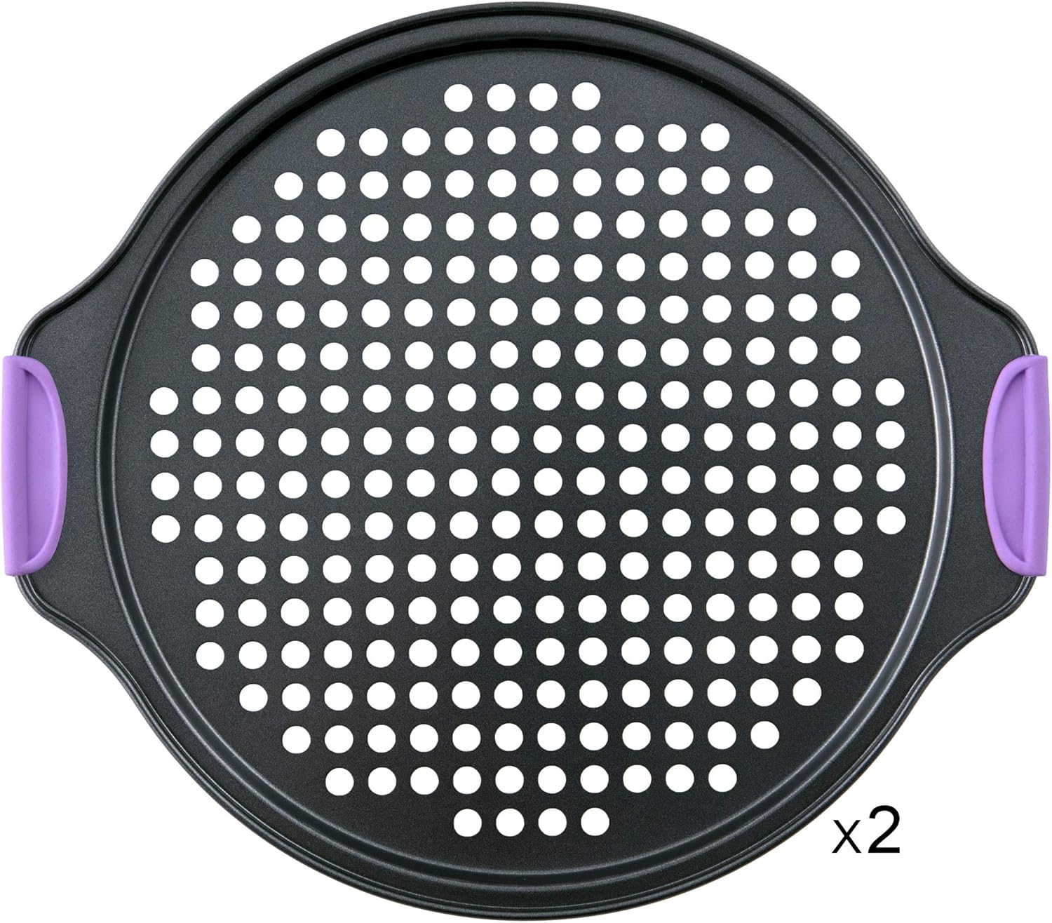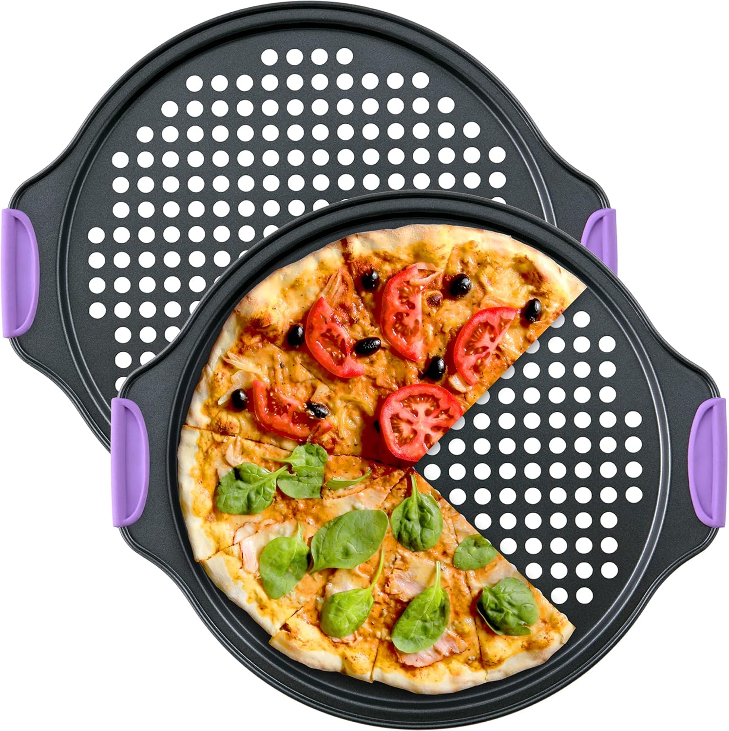 Amazing Abby - Chef Stacy - 2-Pack 13-Inch Non-Stick Pizza Pan with Holes, Perforated Pizza Crisper with Heat-Resistant Silicone Handle Grips, Oven-Safe Bakeware, Carbon Steel Baking Pan for Oven