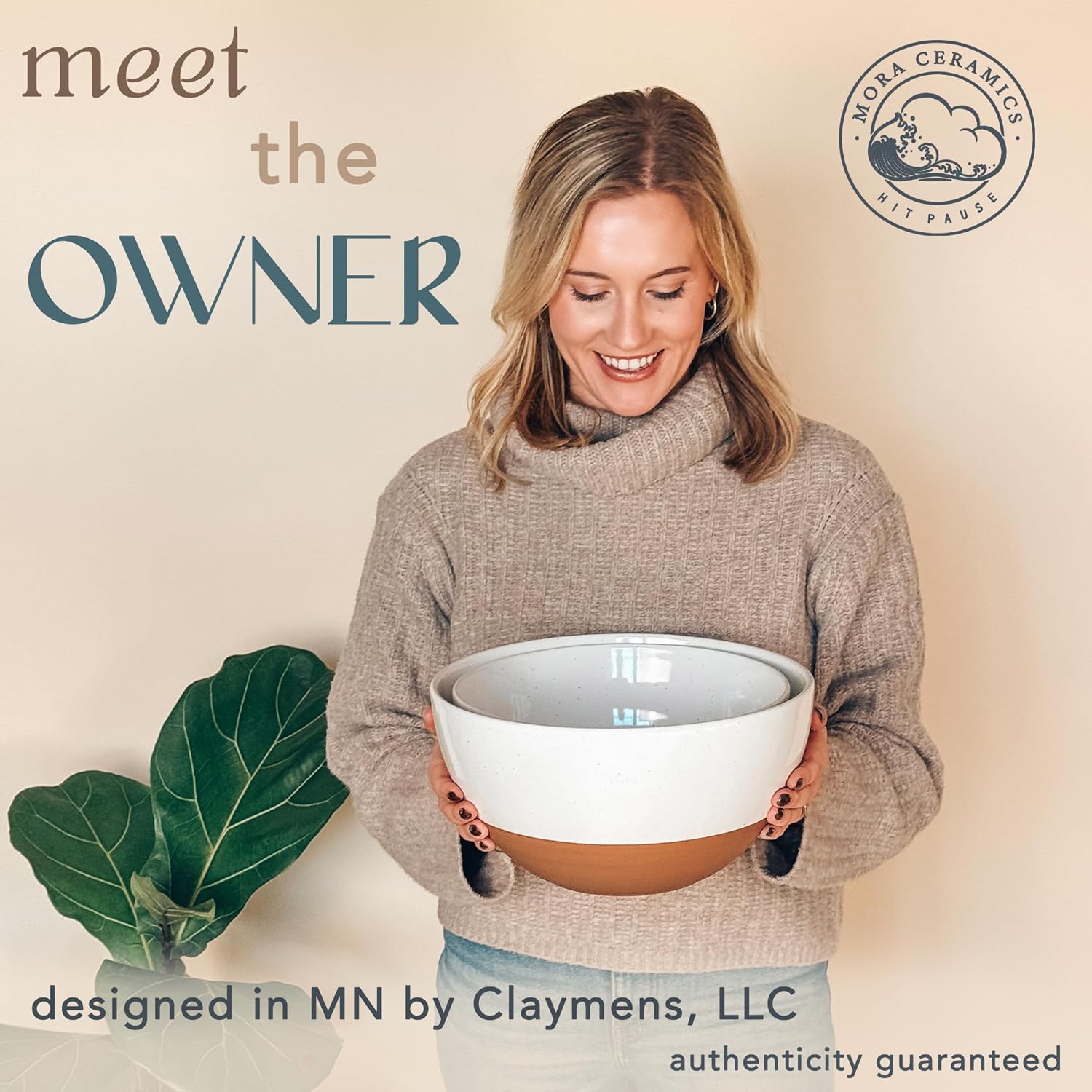 Mora Ceramic Large Mixing Bowls - Set of 2 Nesting Bowls for Cooking, Serving, Popcorn, Salad etc - Microwavable Kitchen Stoneware, Oven, Microwave and Dishwasher Safe - Extra Big 5.5 & 3.6 Qt - White