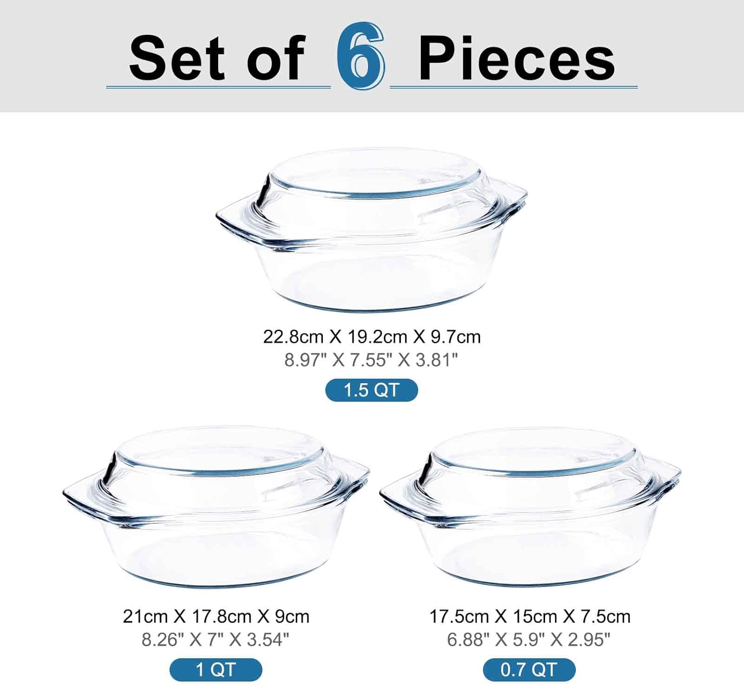 - ✅ Glass Casserole Baking Dish Set: HUSANMP glass casserole set with lids comes in different sizes to resolve all your kitchen serving needs. Includes 3 casseroles with 3 glass lids for meal prep, storage leftovers, and all food storage needs, 3 round casseroles in size 0.7QT+1QT+1.5QT.