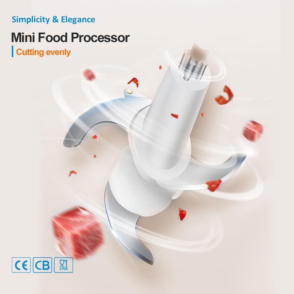 - 【Perfect Design】This Electric Food Processor features a 2600rpm high-speed motor that easily churns a variety of foods. The cutter head is made of steel with a plum blossom interface that snaps firmly into place for smooth operation. With two 1500Amh lithium-ion batteries, super endurance. Featuring a wireless design, it doesn't take up much space and can be easily stored in both cupboards and drawers.