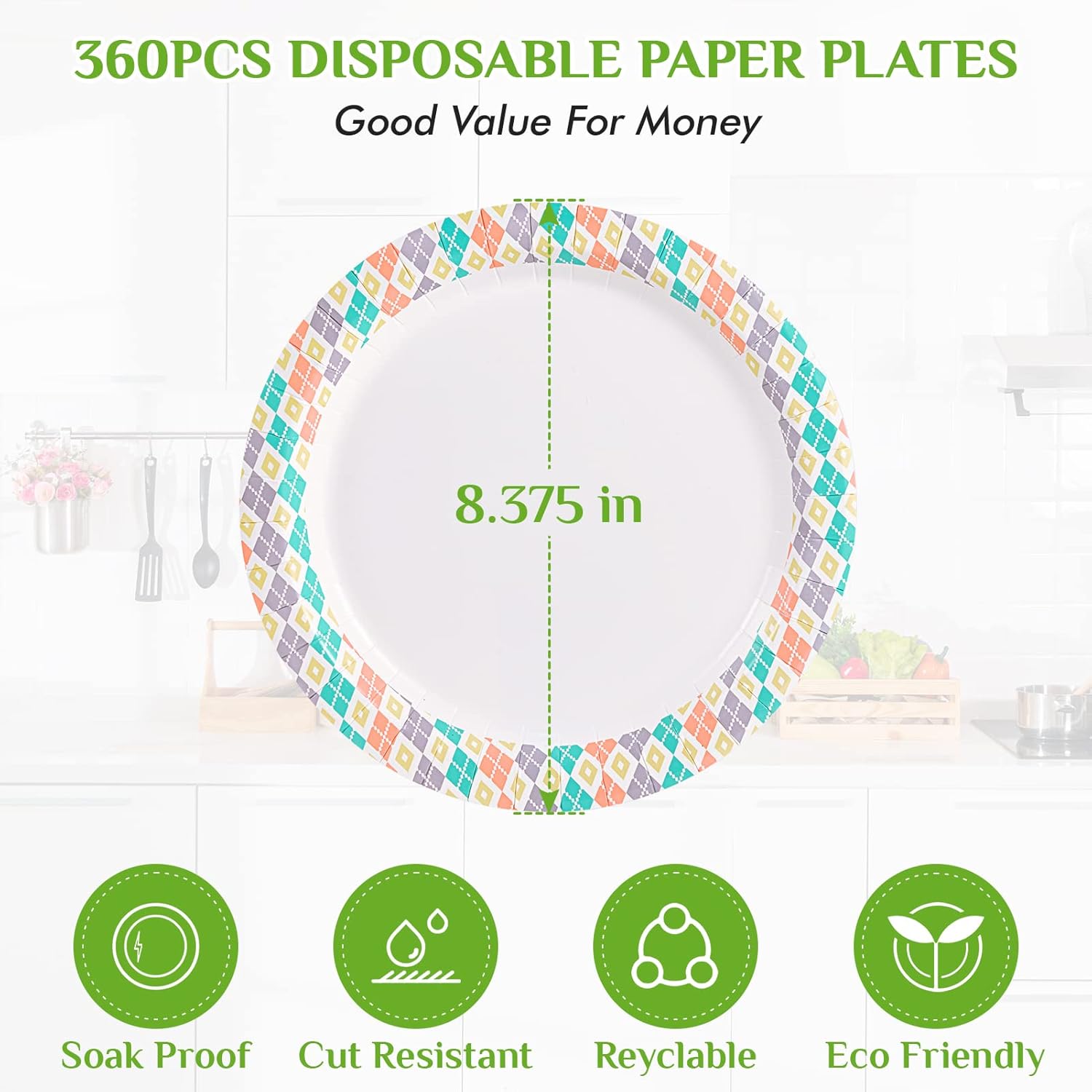FOCUSLINE 360pack Paper Plates 8.375 Inch, Soak Proof Disposable Paper Plates for Everyday Use, 360 Count Plate with Color Checkered Design, Strong and Heavy Duty Round Plate