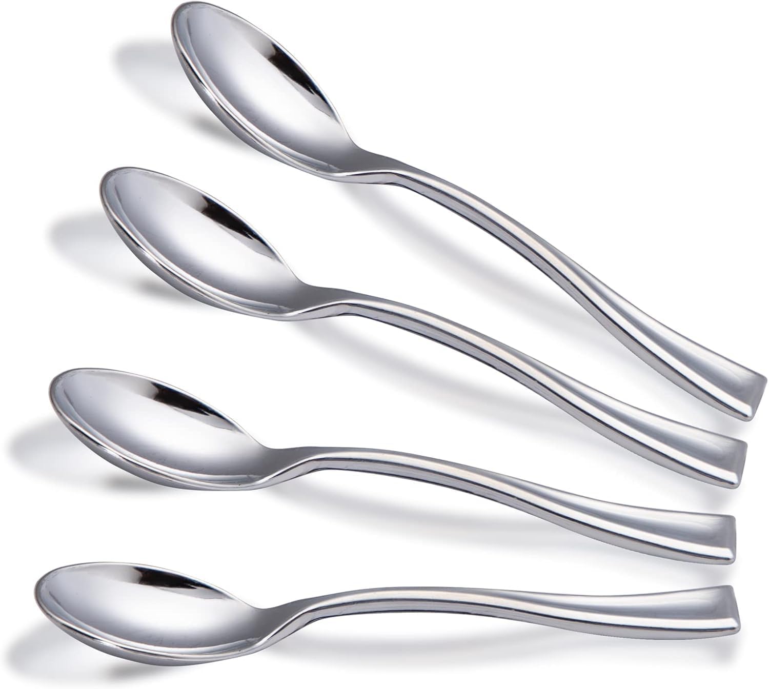 WDF 300 Pieces Plastic Silver Mini Spoons - 4 Inches Silver Plastic Tasting Spoons for Desserts, Heavy Duty Disposable Spoons Perfect for Coffee, Cake, Desserts, Appetizers for Wedding/Party
