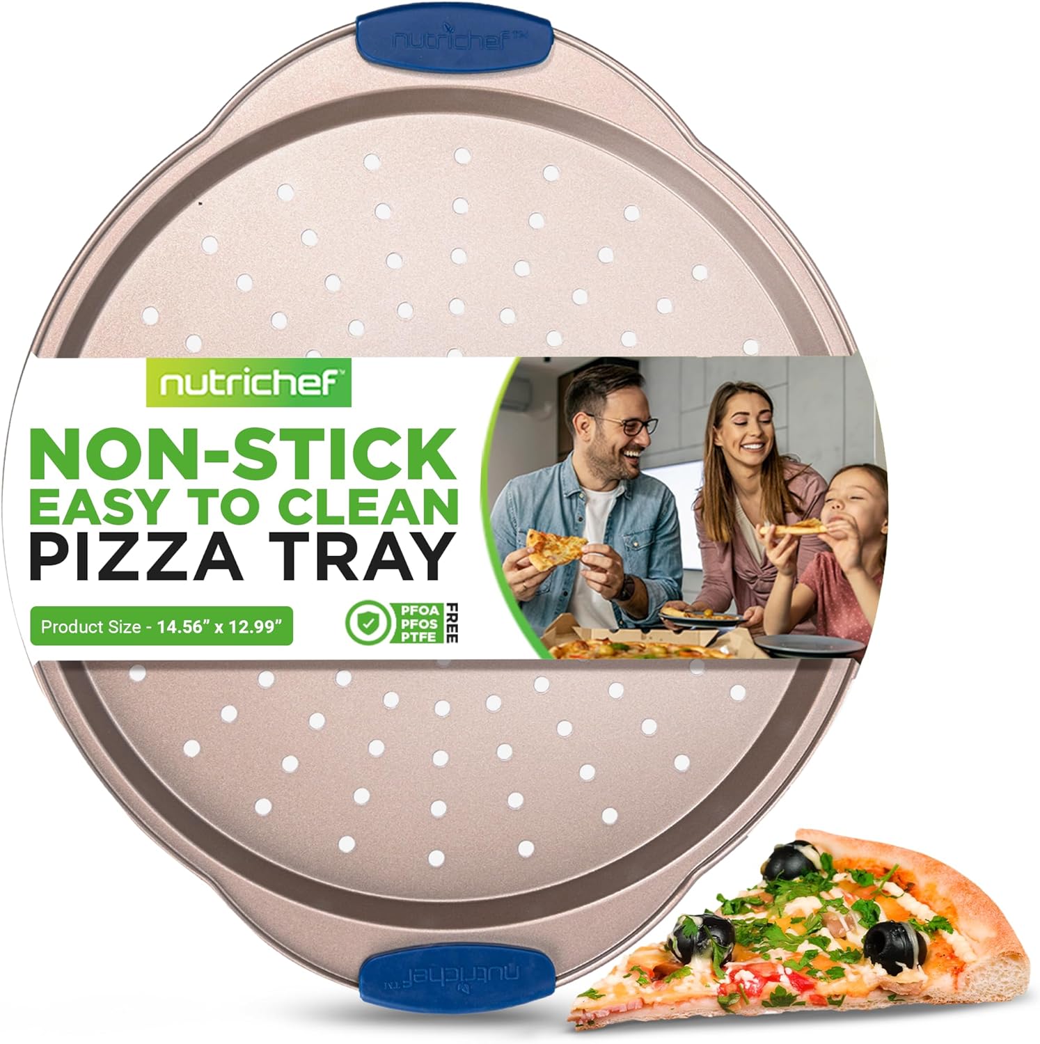 NutriChef 13-Inch Non-Stick Pizza Tray - with Silicone Handle, Round Steel Non-stick Pan with Perforated Holes, Premium Bakeware, Pizza Tray with Extended Handles, Dishwasher Safe - Champagne Gold