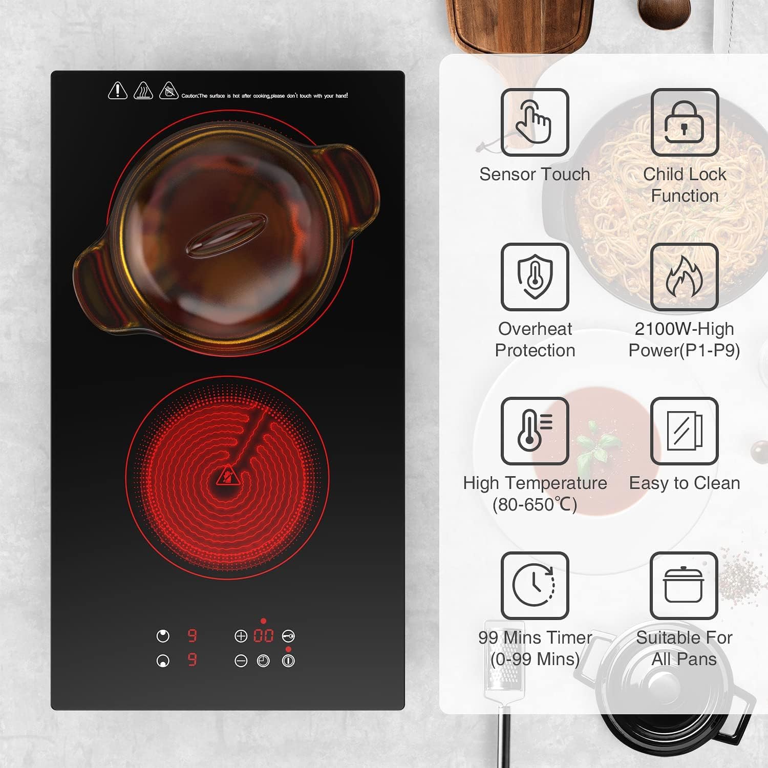- Easy to Control: P file of this electric cooktop has 9 power levels, and C file has 20 temperature adjustments with 2100W power to choose from. Meet all your cooking needs: heating, steaming, frying, deep-frying, hot pot, grilling, boiling, roasting. The maximum power of the upper zone is 1200 watts, and the maximum power of the lower zone is 900 watts. Ensure fast cooking and time-saving in daily life