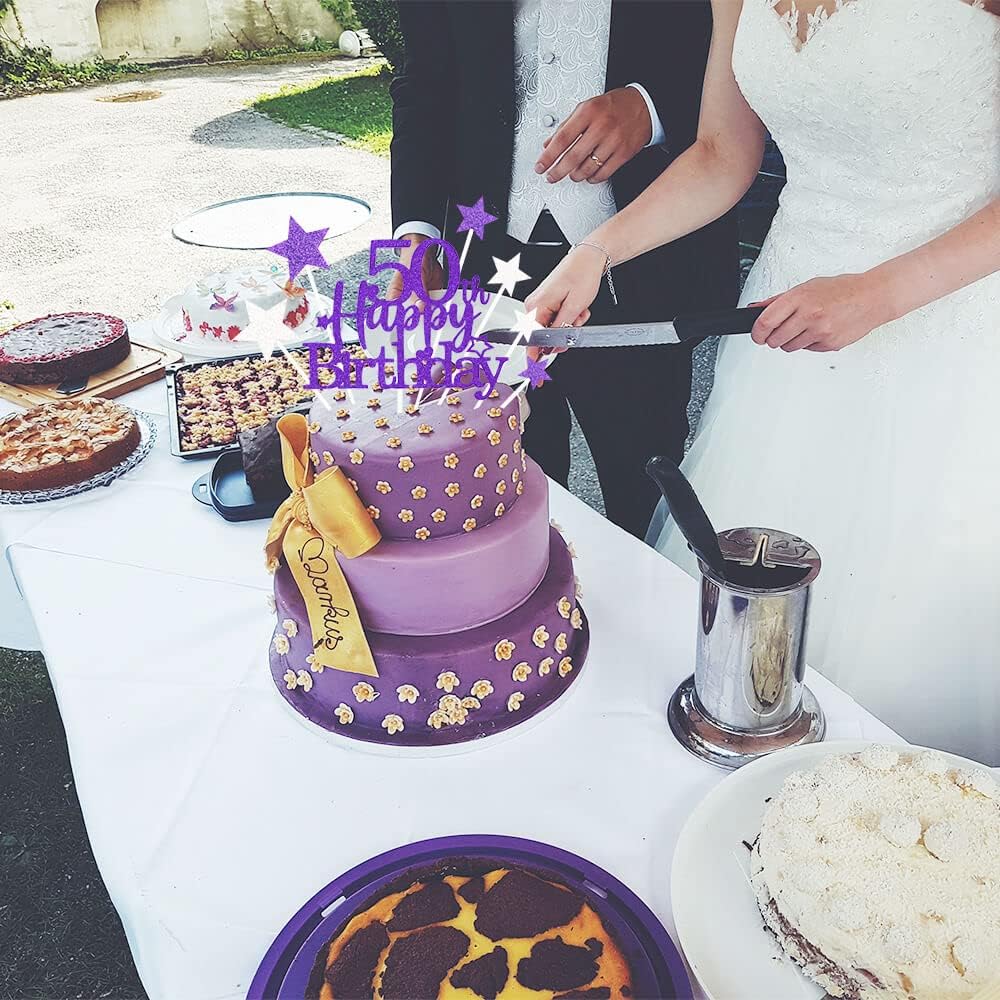 Glittery 50th Happy Birthday Cake Topper with Star,Personalised 50 Birthday Cake Toppers Party Decorations Party Supplies for Men Women Purple Silver
