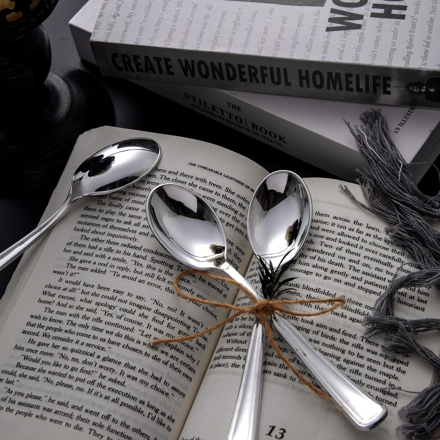 - ELEGANT AND EXTRA HEAVY DUTY : Silver dessert spoons are heavyweight plastic spoons than typical silver plastic cutlery, the beautiful, disposable flatware is the color of polished silver. Their reflective metallic surface creates a lovely shine and look like real silverware. Their silver finish will not chip or flake during use. Not to mention, itβs nice having disposable plastic spoons that fit your hand like normal silverware.