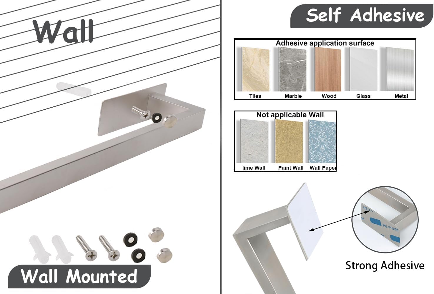 - EASY INSTALLATION: Towel holder has 2 mounting methods, adhesive or screw in, you can choose one of them according to your usage.. We provide detailed installation instructions in the package. Even if you don't have any โhands-madeโ experience, you can follow the installation instructions to complete the installation quickly. NOTE--Only suitable for installation on tile, marble, glass, stainless steel walls, not suitable for wallpaper, drywall, painted walls and other non-smooth walls.(Will tear off your wall)