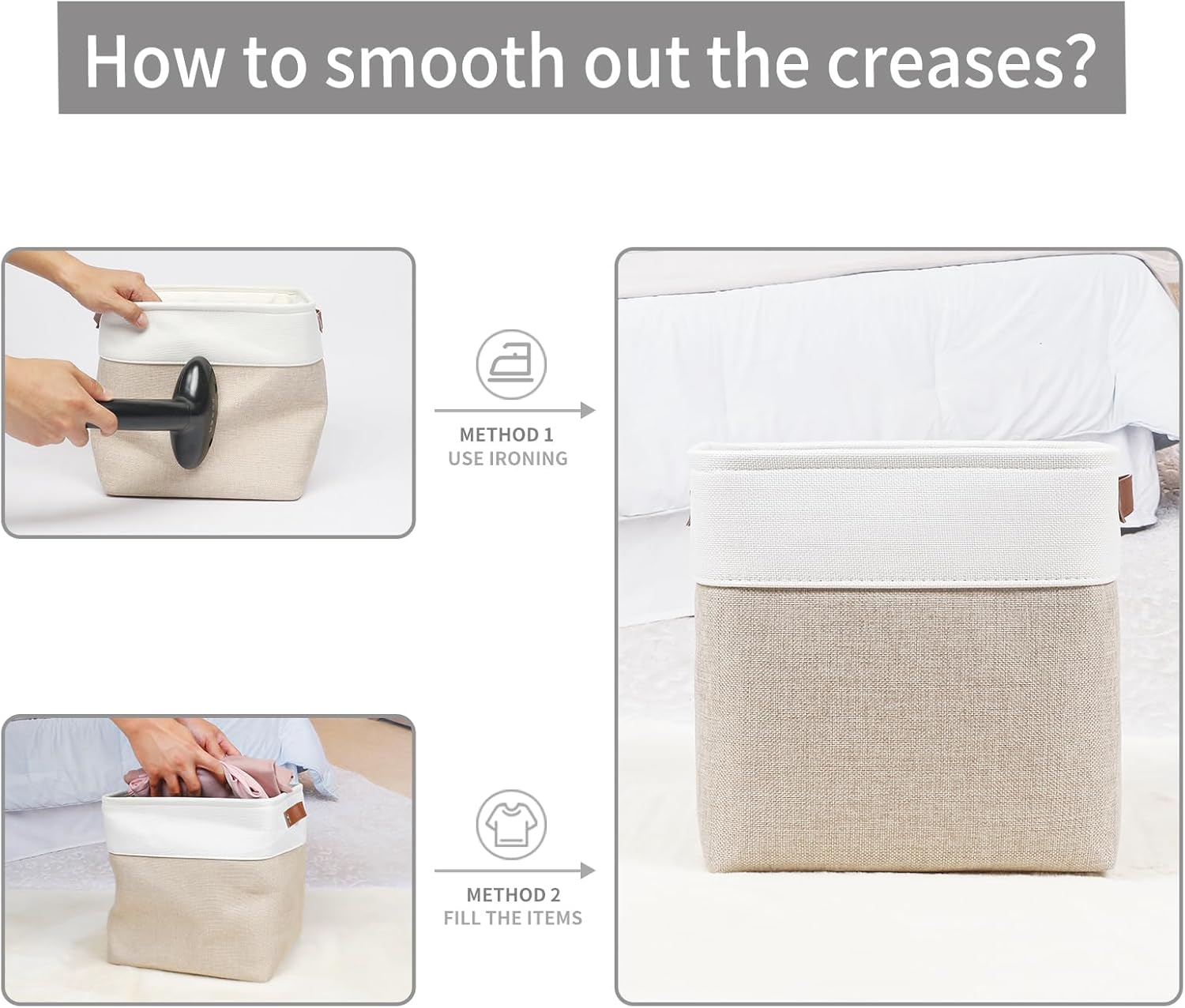- 【Maintenance & Care Tip】 - Collapsible design for space saving. Our foldable baskets comes in a compression packing which may result in wrinkled storage bin during the long transit. Get rid of the wrinkles by either stuffing the fabric storage bins with blankets and pillows for a few days or steam iron them at low-heat setting. The organization baskets are easy to clean, you can dust the basket with a soft cloth with light soapy water when needed. Not recommended to machine wash.
