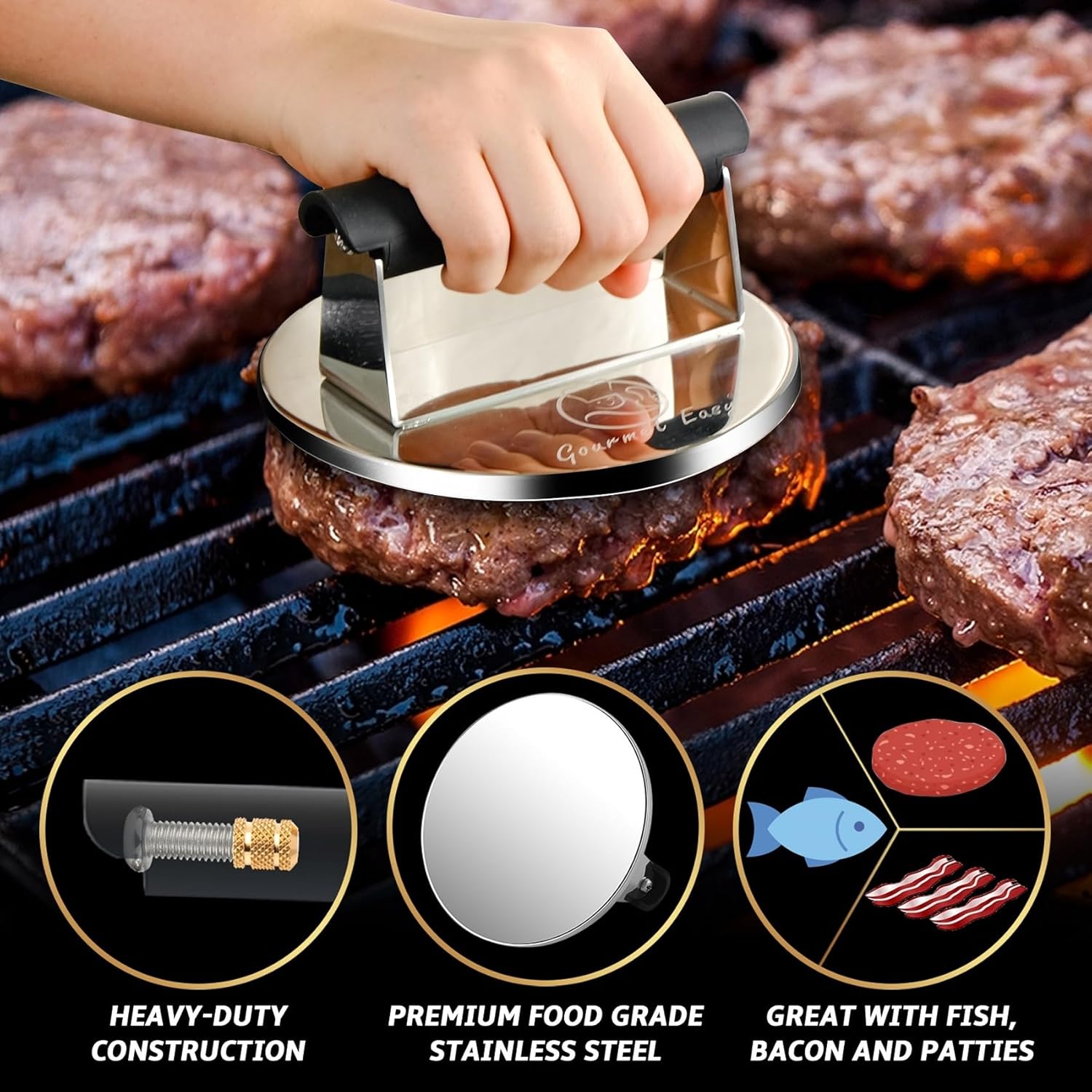 - SMOOTH & FLAT SURFACE: Gourmet Easy smashburger press with non-stick flat surface ensures easy release of meats, and also helps you for easy cleaning. A durable heavy duty stainless steel burger press for griddle will give you perfectly shaped burgers in no time!