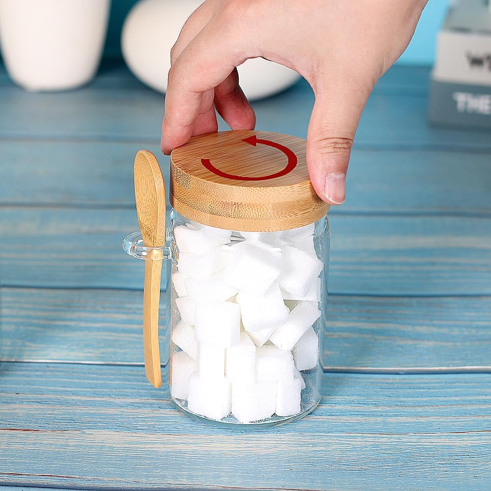 - [Product Capacity] The glass jars with spoon and lid's size is 3.15x4.92 inch(8cmx12.5cm), can hold about 15 OZ liquid. The small glass container with lid airtight and the borosilicate glass together make it a perfect accessory for your home, kitchen, office, restaurant or coffee shop.