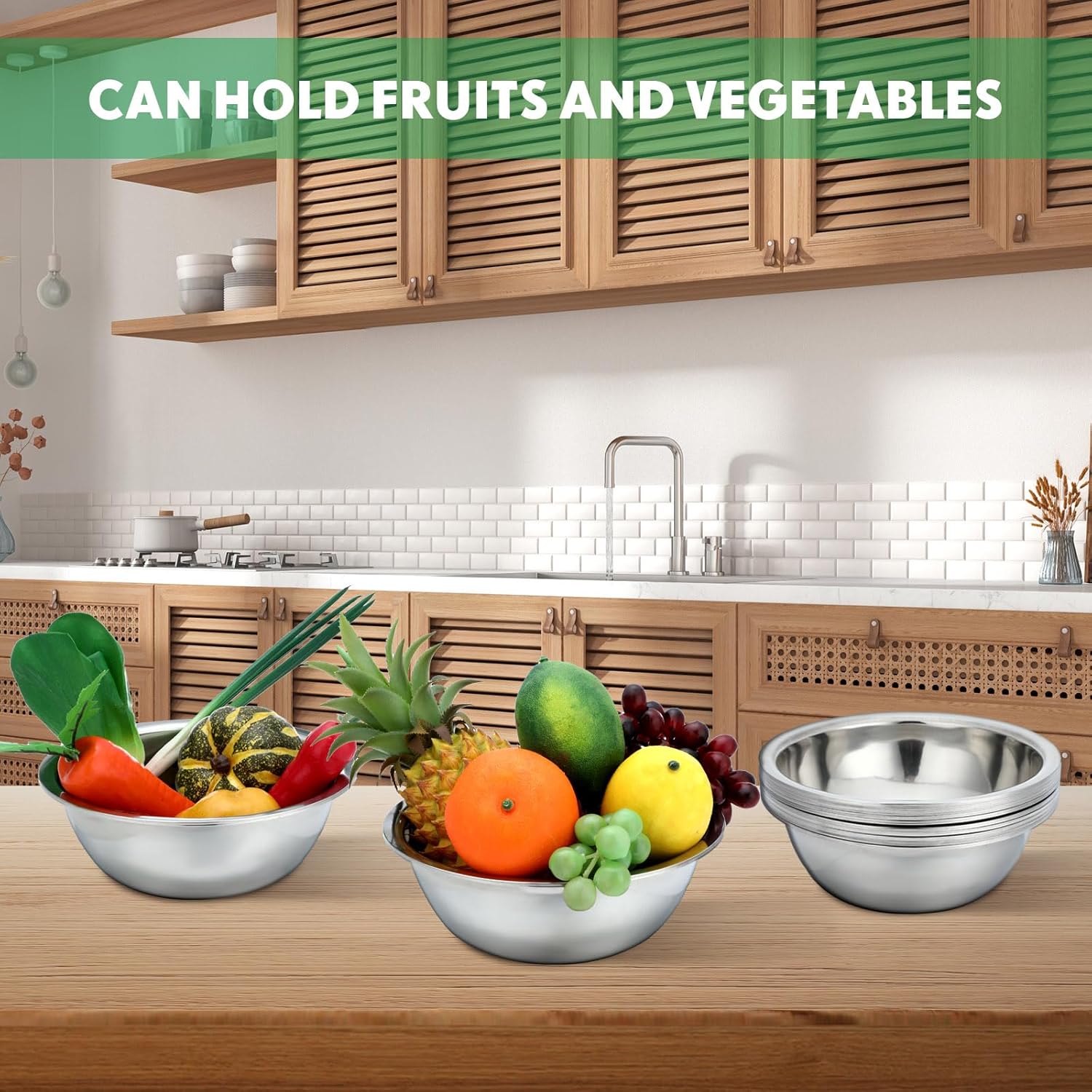 - Stainless Steel Mixing Bowl Set: what you will receive are 12 pieces of stainless steel bowls for mixing in silver color, metal food prep bowls are about 10.2 x 10.2 x 3.26 inches/ 26 x 26 x 8.3 cm which can be applied as both baking mixing bowls and serving bowls adequate quantity can well meet your daily use, replacement and sharing demands