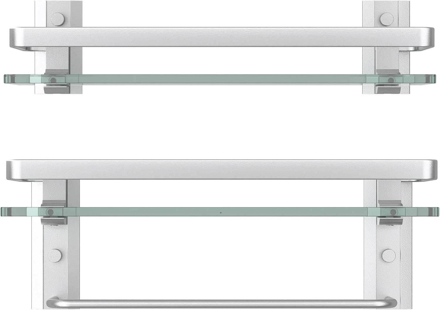• Complete 2-Piece Set: Includes two tempered glass shelves with aluminum guardrails—one with an integrated towel bar, providing versatile storage solutions for your bathroom