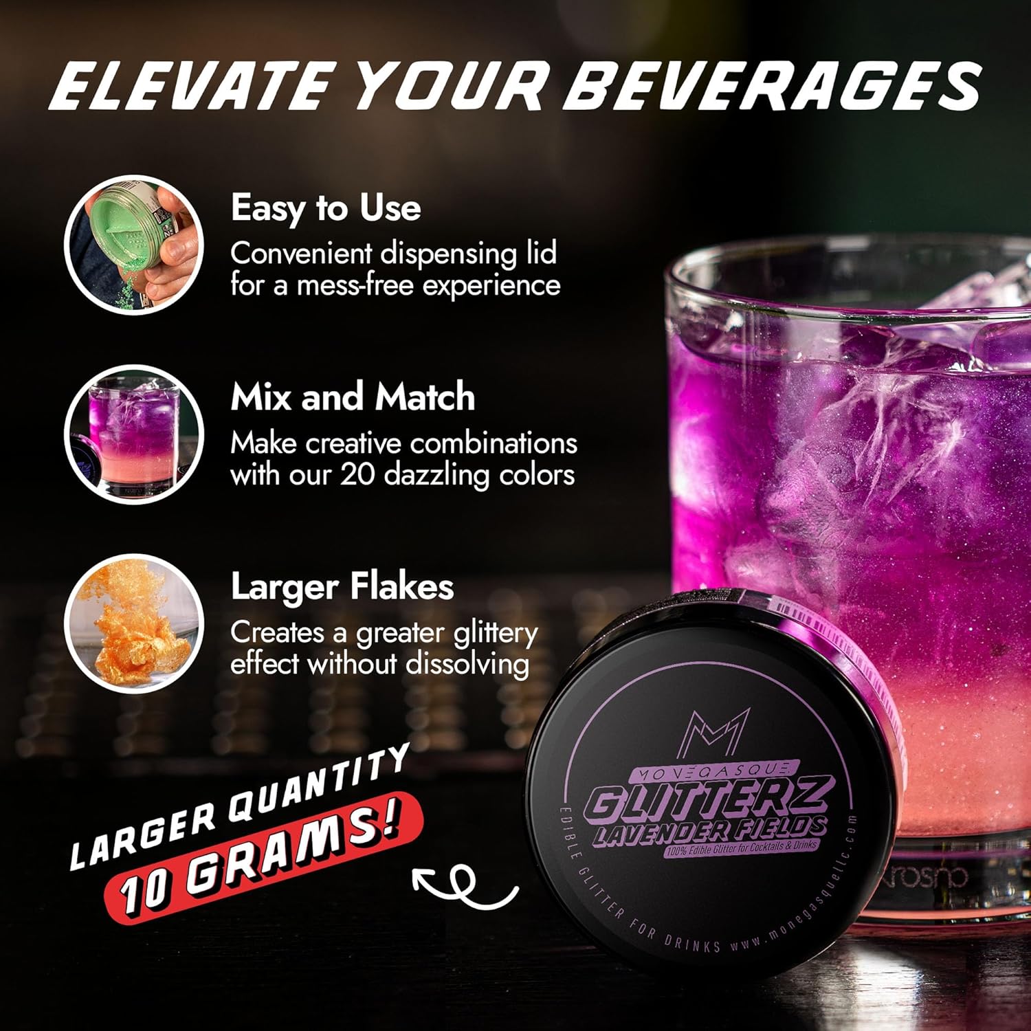 - PREMIUM EDIBLE GLITTER FOR COCKTAILS – Add a touch of glamour to your creations with MONÉGASQUE Glitterz. Perfect for cocktails, cakes, and more, our halloween glitter is flavorless and safe, crafted from mica-based pearlescent and food-grade colorants.