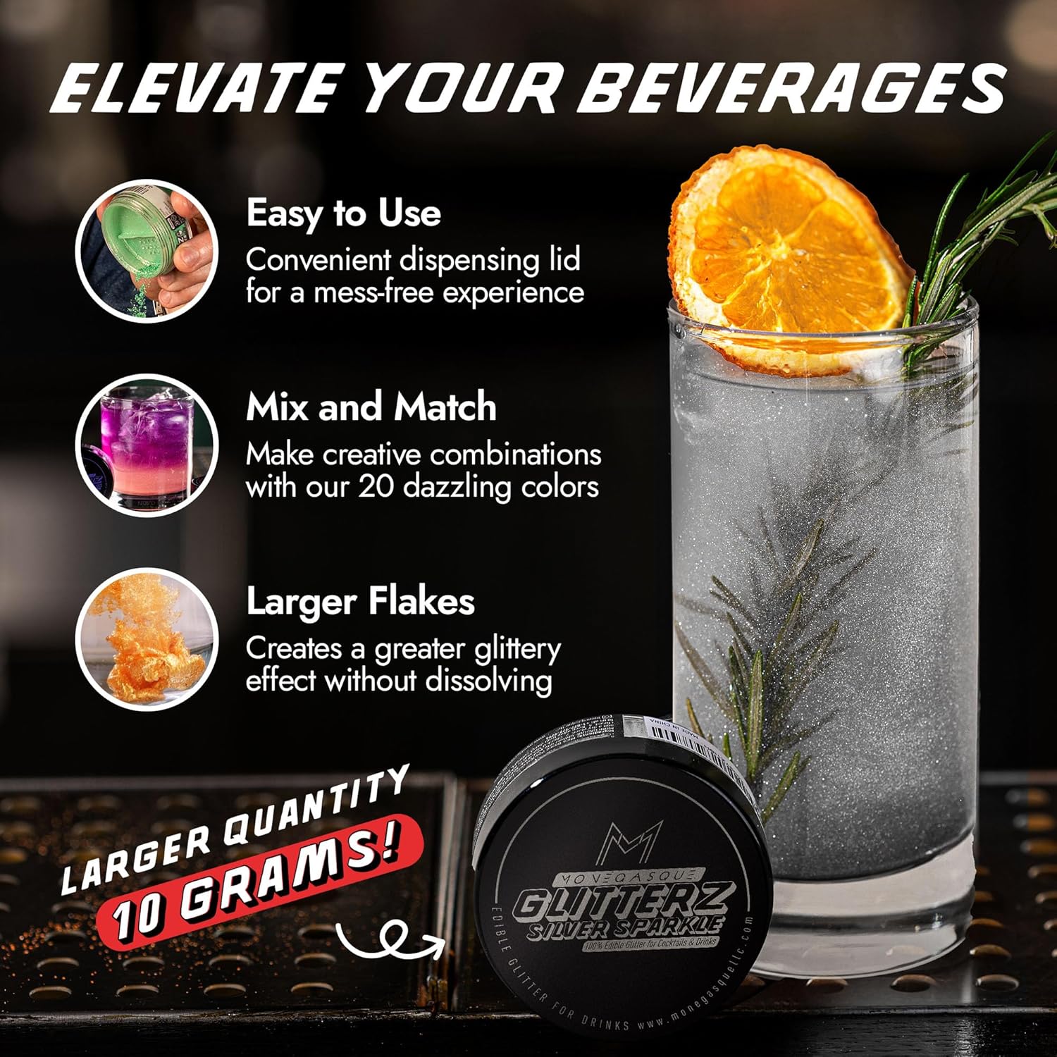 - PREMIUM EDIBLE GLITTER FOR COCKTAILS – Add a touch of glamour to your creations with MONÉGASQUE Glitterz. Perfect for cocktails, cakes, and more, our halloween glitter is flavorless and safe, crafted from mica-based pearlescent and food-grade colorants.