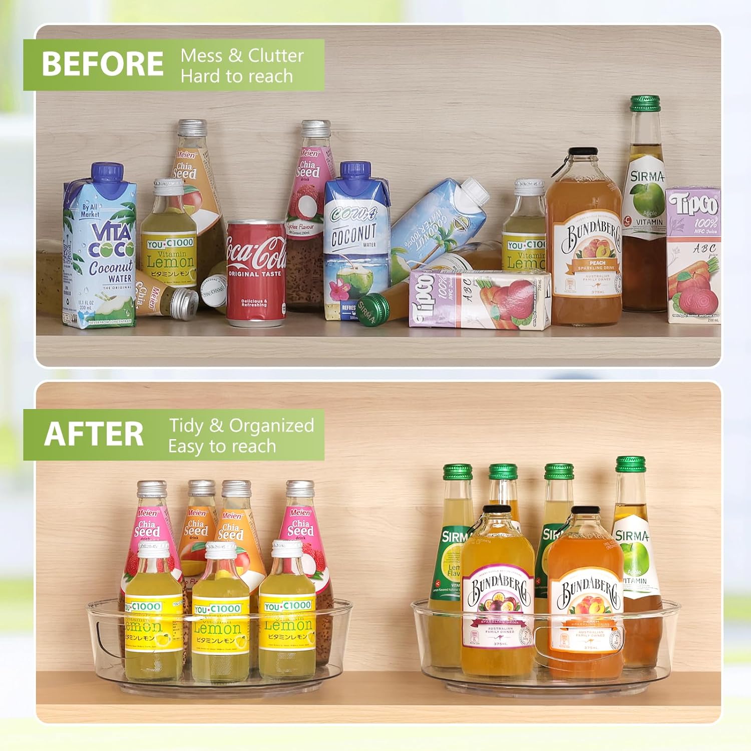 - High Sides & Handle Design- Our pantry lazy susan comes with raised edge, providing excellent support and preventing items from falling off even when the lazy susan is rotating quickly. And the built-in handles make it easy to carry and move to anywhere you want