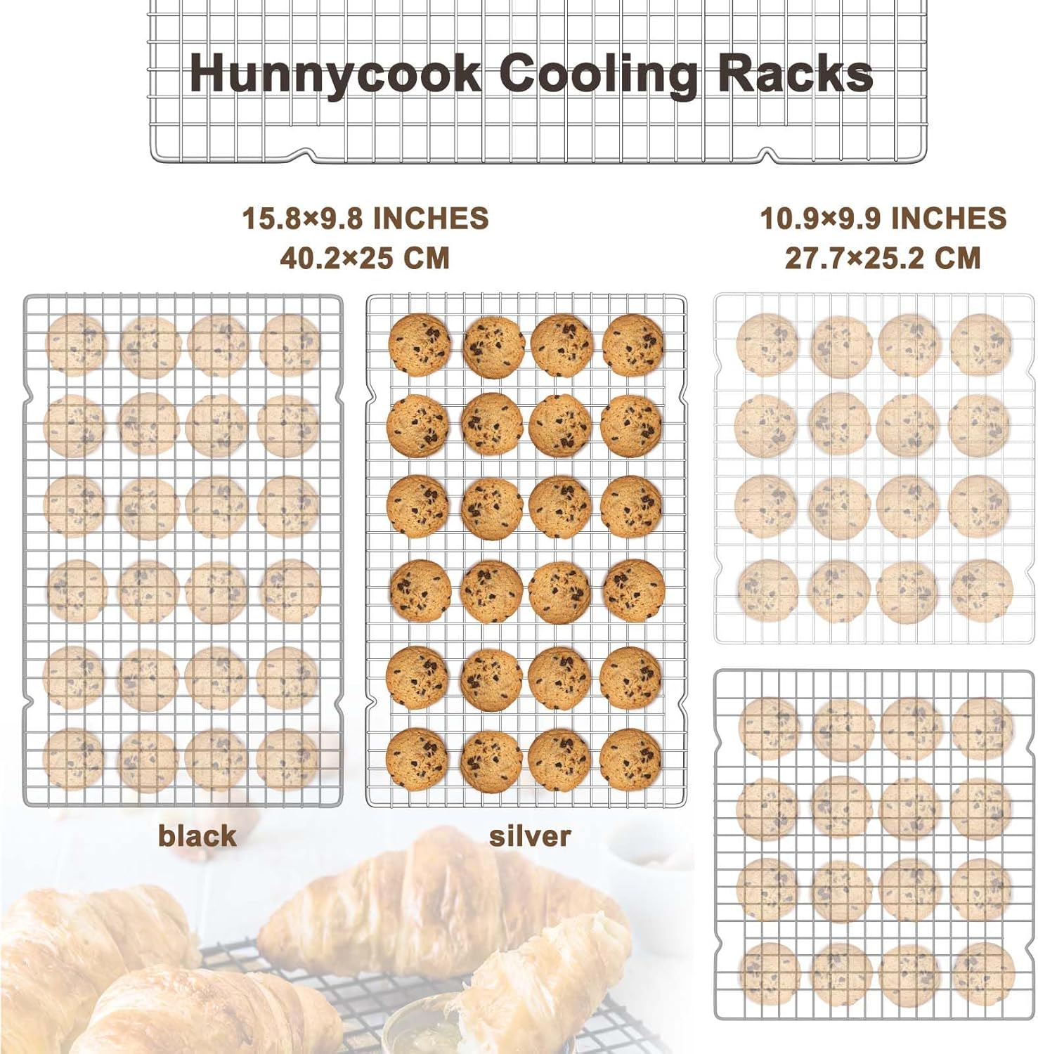 - 【3 PCS Cooling Racks】Hunnycook cooling rack set includes three silver 15.8”×9.8” cooling racks, offering a more affordable option compared to the market's packs of two or single racks. The quantity of our racks not only meets the daily cooking and baking needs but also provides extra replacements. Additionally, Hunnycook offers a variety of sizes and colors in oven racks for you to choose from, ensuring versatility to suit your preferences