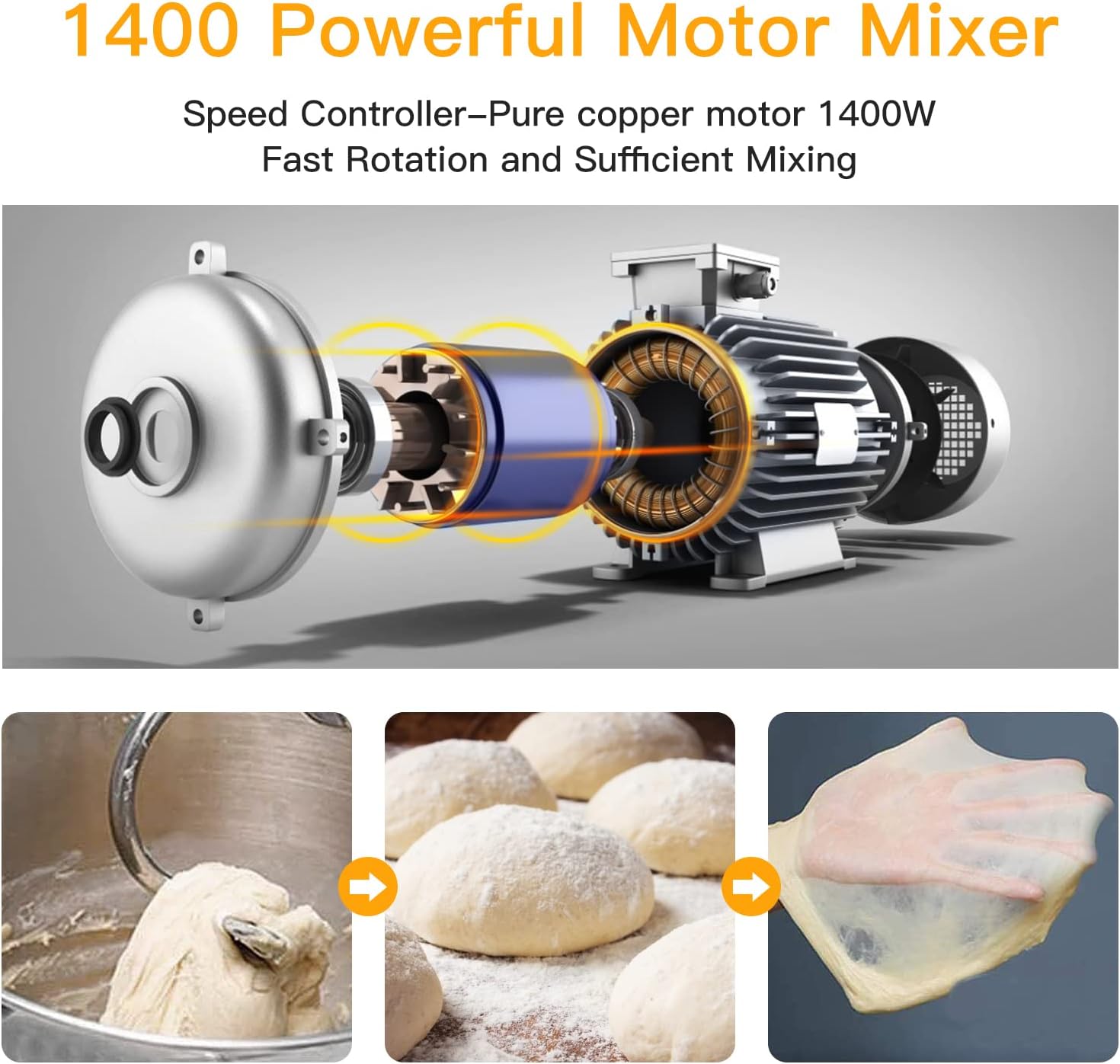 - Tilt-head & Anti-slip Design: Easily install or uninstall the bowl and accessories with the tilt-head design. The 6 anti-slip silicone suction cups and solid connecting rod ensure stability, reducing vibration and noise. The dough machine stops working when you lift the top half for added safety during kneading