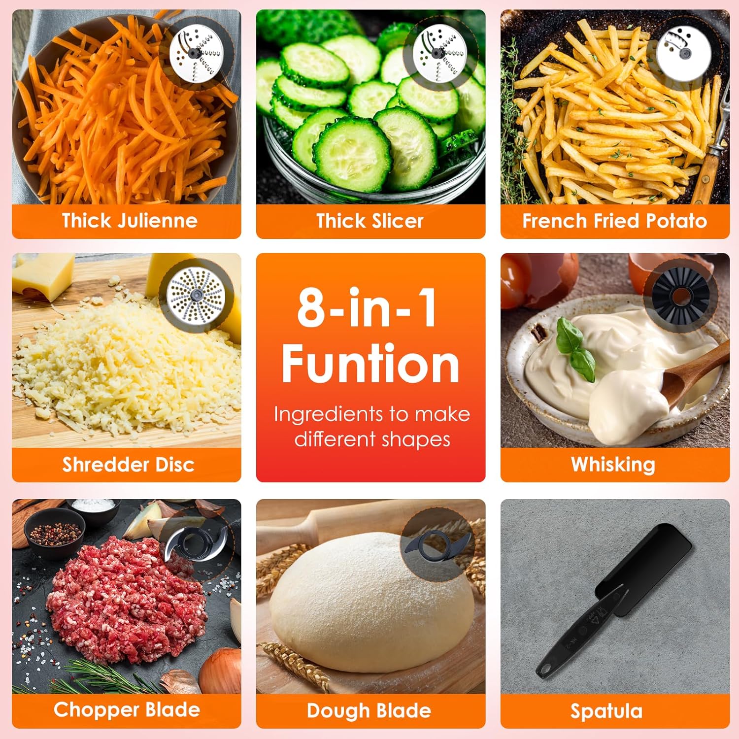 - ă8-in-1 Food ProcessorăHomtone food processor can handle chopping, mincing, slicing, shredding, kneading, whipping egg whites & cream, etc. Easily knead large quantities of dough, chop large quantities of vegetables, it will fulfill all your food processing needs.