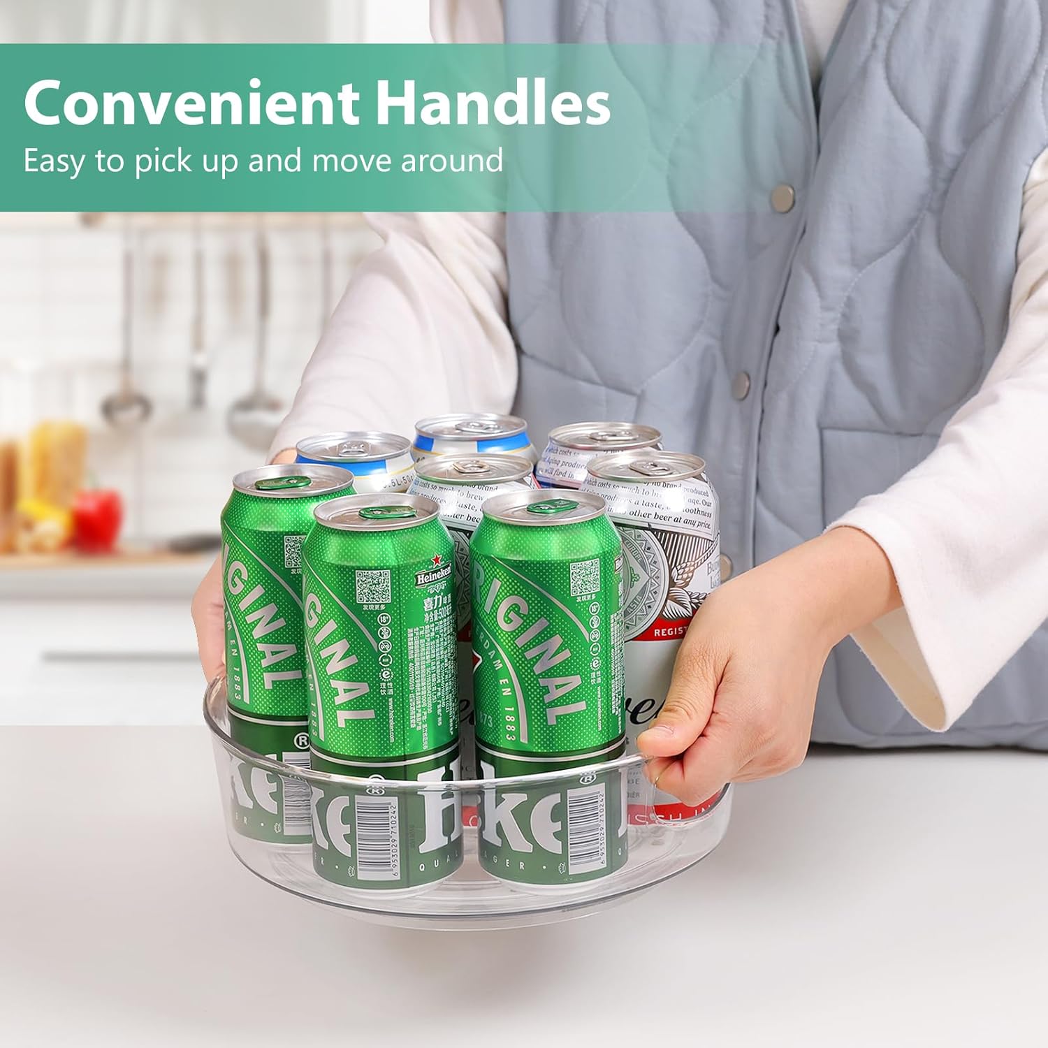 - High Sides & Handle Design- Our pantry lazy susan comes with raised edge, providing excellent support and preventing items from falling off even when the lazy susan is rotating quickly. And the built-in handles make it easy to carry and move to anywhere you want