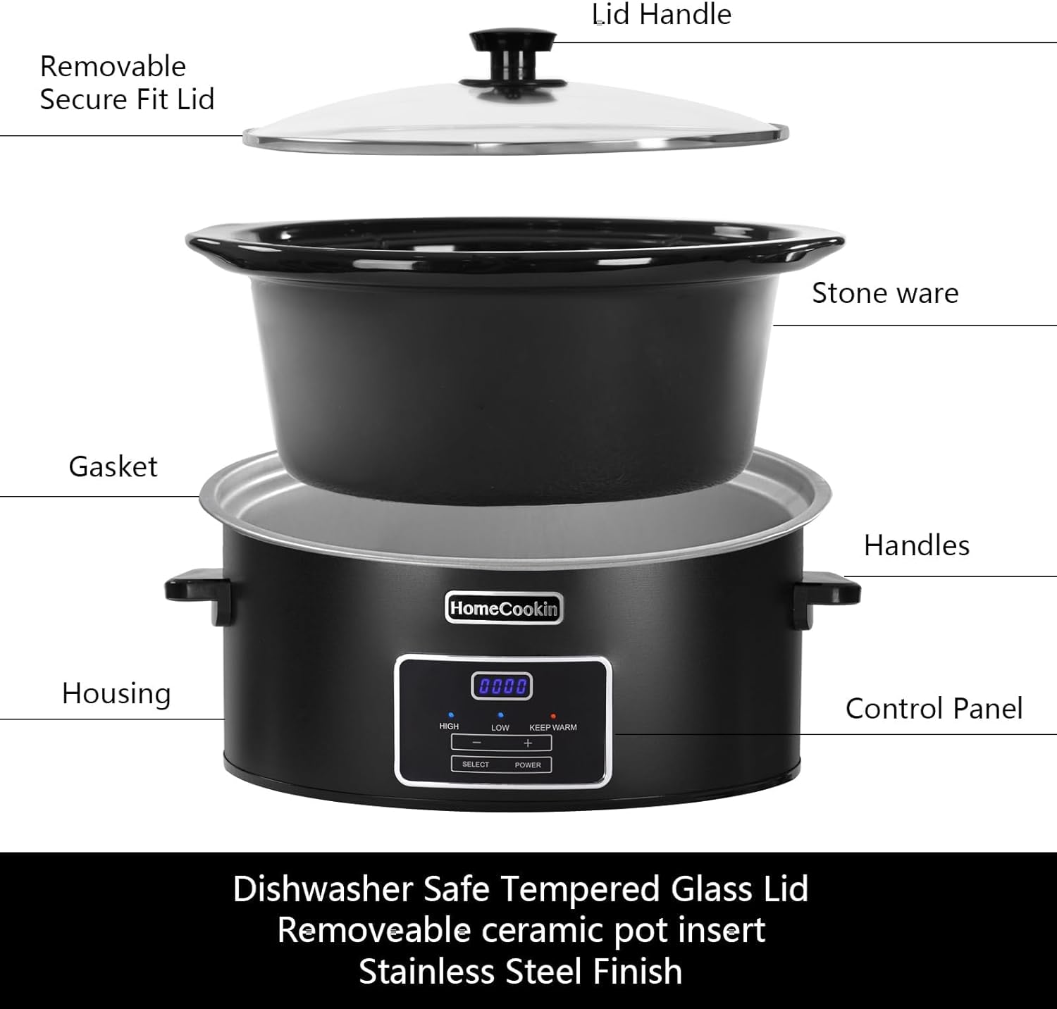 HOMECOOKIN 8 Quart Programmable Slow Cooker, Kitchen Appliances, Perfect Kitchen Small Appliance for Family Dinners, Black Stainless Steel