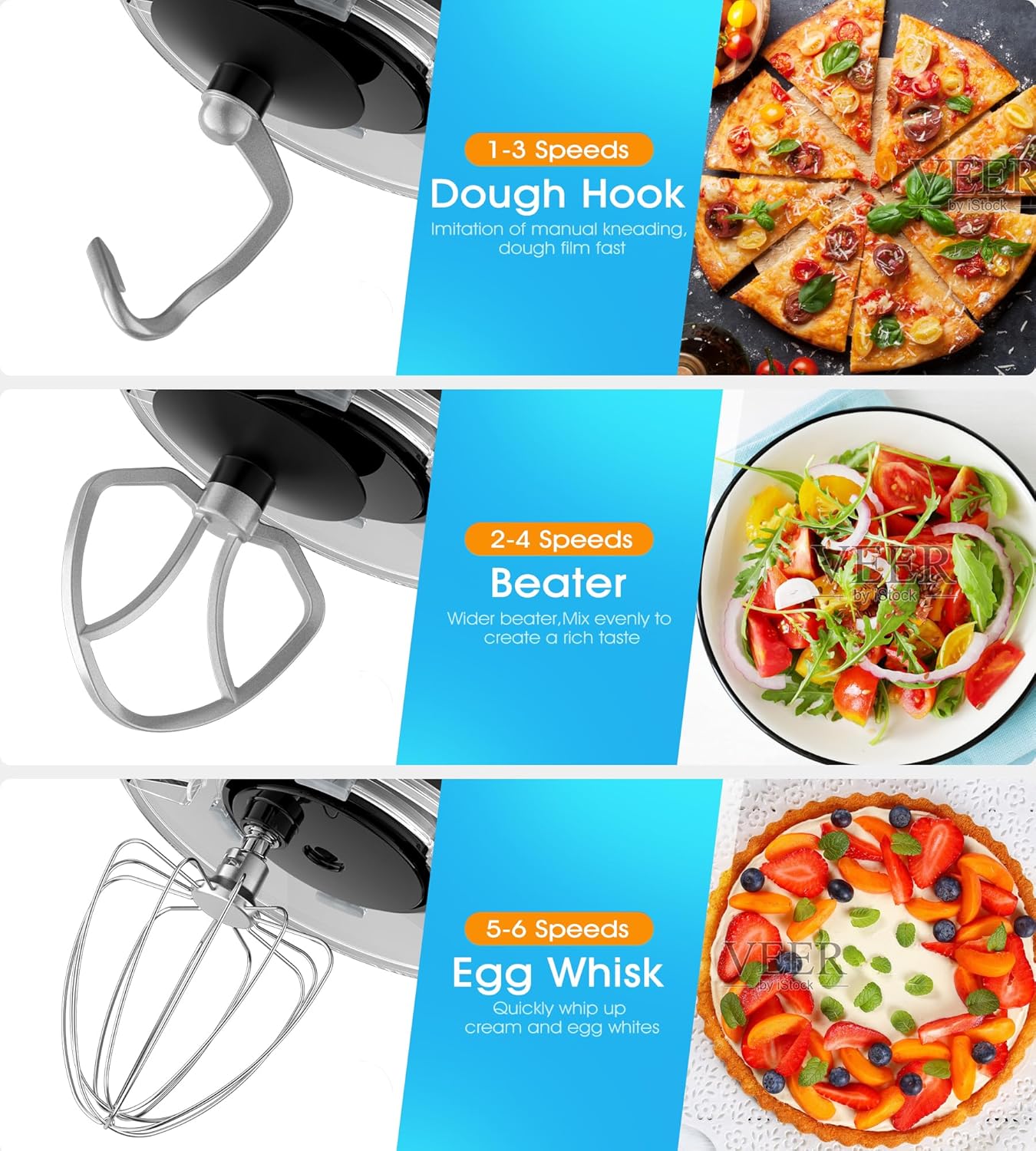 - 🍰【Multifuntion & 360°Standing Mixer】:our kitchen standing mixer with 3(+1) stainless steel attachments:dough hook/egg whisk/beater,Splash guard with access easily hatches addition of materials,360°no trace stirs mix,which realize fast mixing without layering,make the stirring more thorough, no scratches.