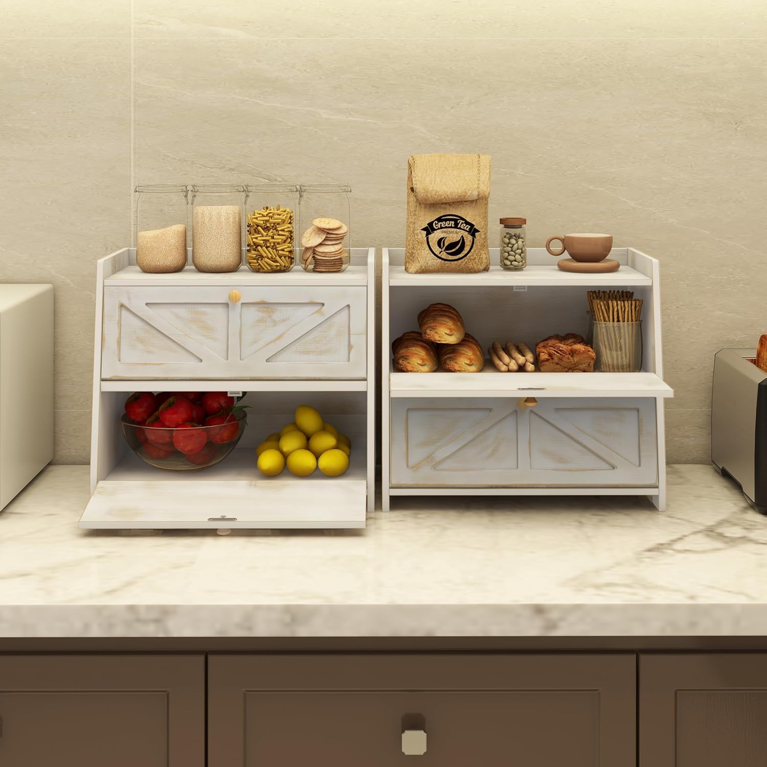 - Large Capacity:Our bread box with 2 layers of 15.8”L x 9.8”W x 13.8”H board are large enough to hold 2 large loaves of bread, rolls, muffins, and more. Flat top design,any kitchen items you want can be placed on the bread box. It can meet the needs of your family
