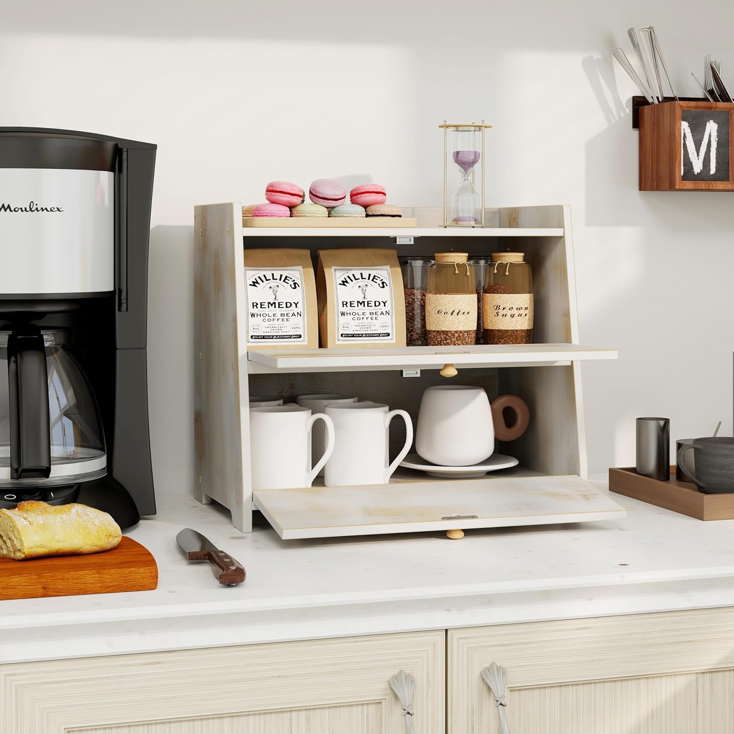 Vintage Double Layer Bread Box for Kitchen Counter Bamboo Bread Storage Container Large Capacity Bread Storage Bin (Antique White)