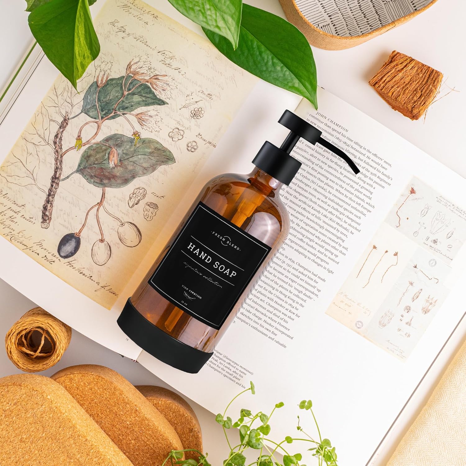 Vine Creations Amber Glass Soap Dispenser Set - Kitchen Soap Dispenser Set with Stainless Steel Pump - 16 oz Dish Soap and Hand Soap Dispensers for Bathroom with Silicone Pad & Waterproof Labels
