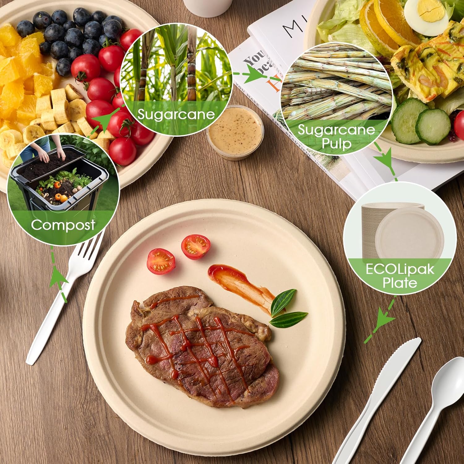 ECOLipak Paper Plates 10 Inch, 150 Pack Compostable Heavy Duty Disposable Biodegradable Sugarcane Bagasse Eco Friendly Paper Plates for Party Dinner