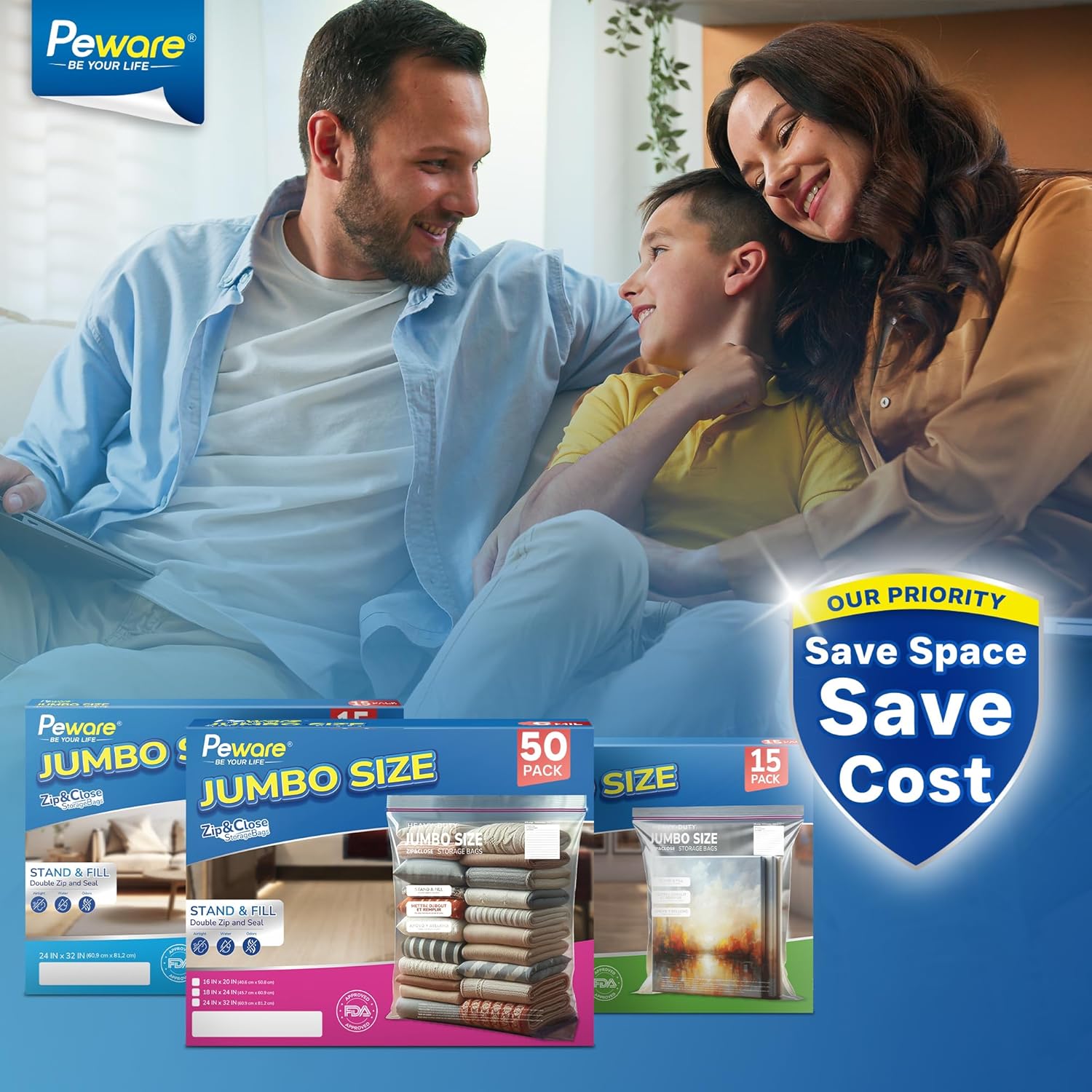 Large Storage Bags, 16"x20" Jumbo Plastic Bag, BPA Free, 3.5 Gallon XL Zipper Lock Baggies for Clothes Pillow Travel Moving - 15 Roomy Bags