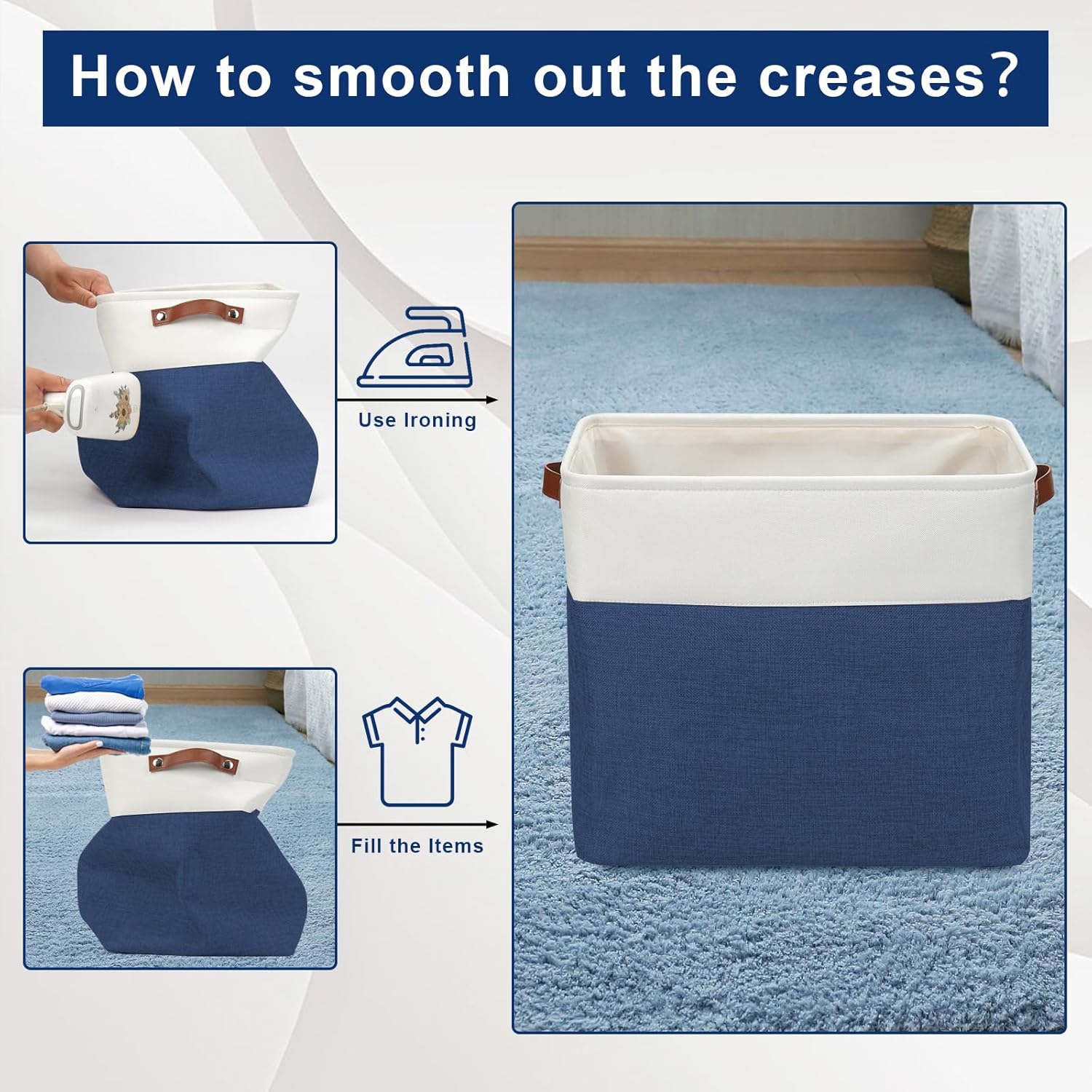 - 【Maintenance & Care Tip】 - Collapsible design for space saving. Our foldable baskets comes in a compression packing which may result in wrinkled storage bin during the long transit. Get rid of the wrinkles by either stuffing the fabric storage bins with blankets and pillows for a few days or steam iron them at low-heat setting. The organization baskets are easy to clean, you can dust the basket with a soft cloth with light soapy water when needed.