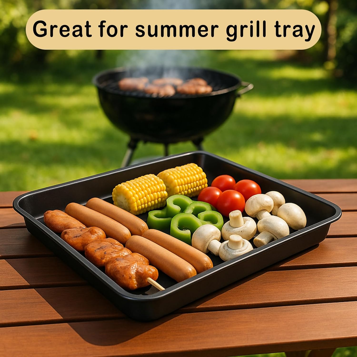 - Baking Different Food at a Time: The sheet pans for baking can allow both toaster oven pan 11inch fit side by side on a oven rack, so you can baking different food at the same time and prevent mess. This black 11inch baking tray also use at guest house, outdoor pellet grill as cooking tray or summer grilling tray