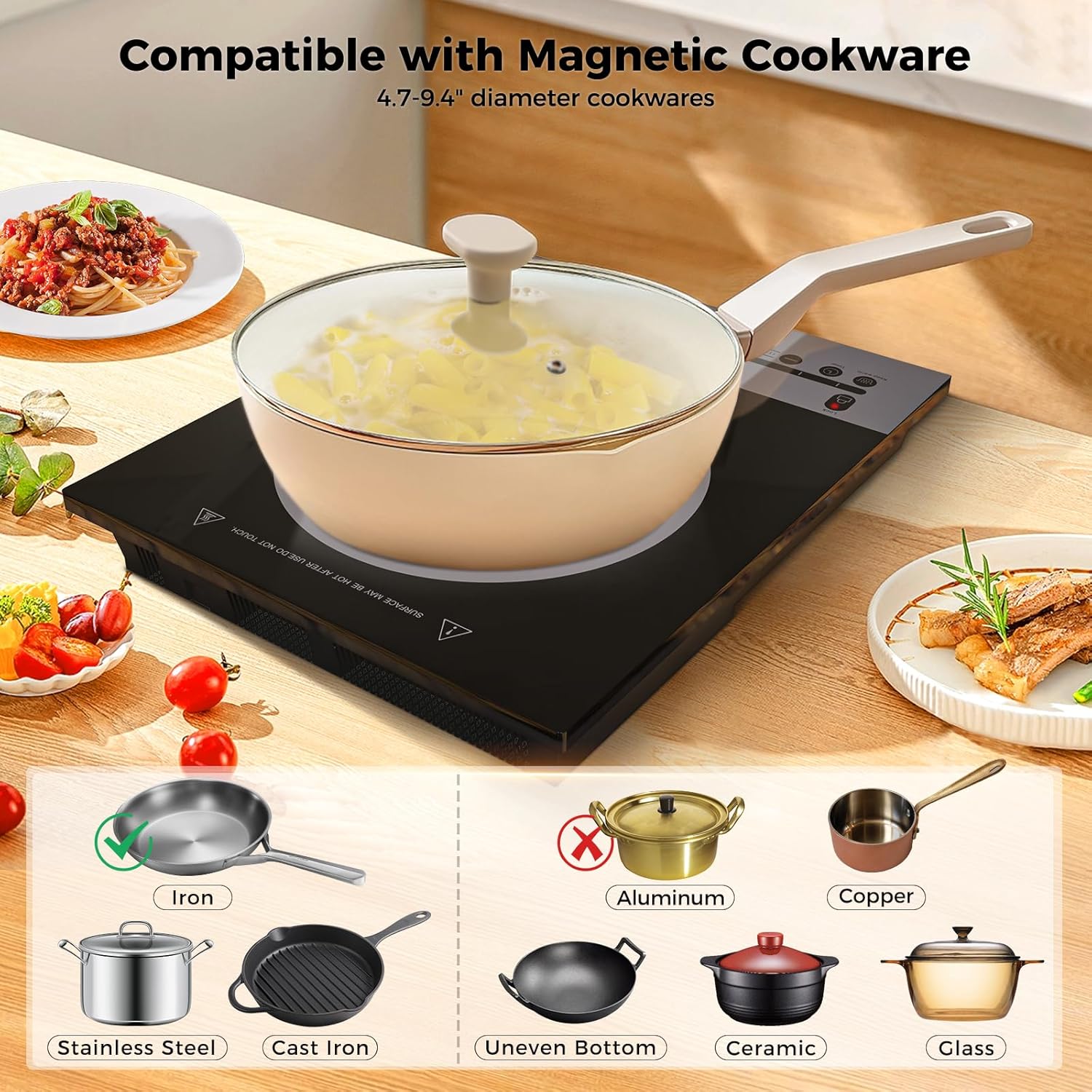 - Works with Magnetic Induction Cookware: Electric Single burner stovetop is compatible with magnetic induction cookware like cast iron, iron, and stainless steel cookware. Suitable for 4.7-9.4" cookware