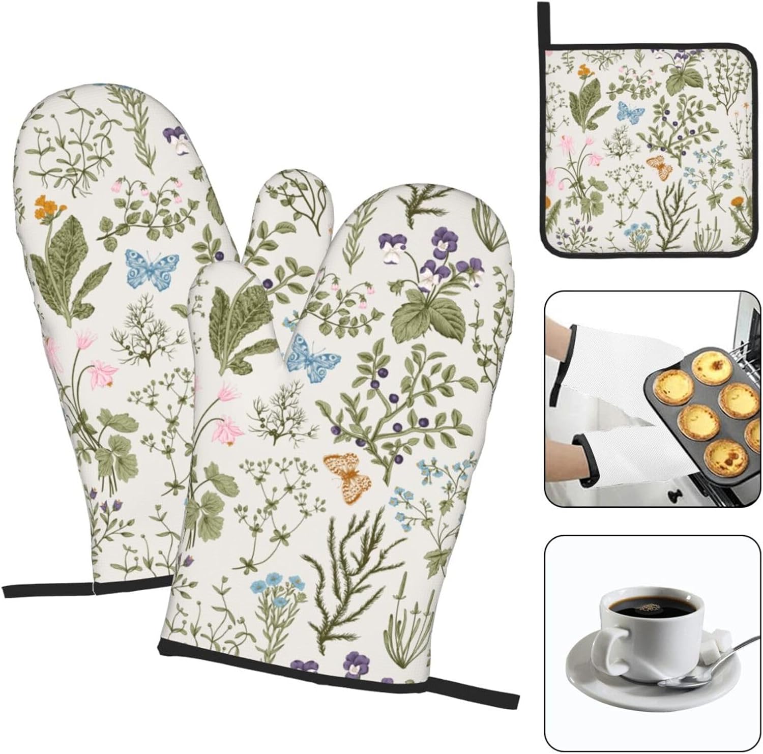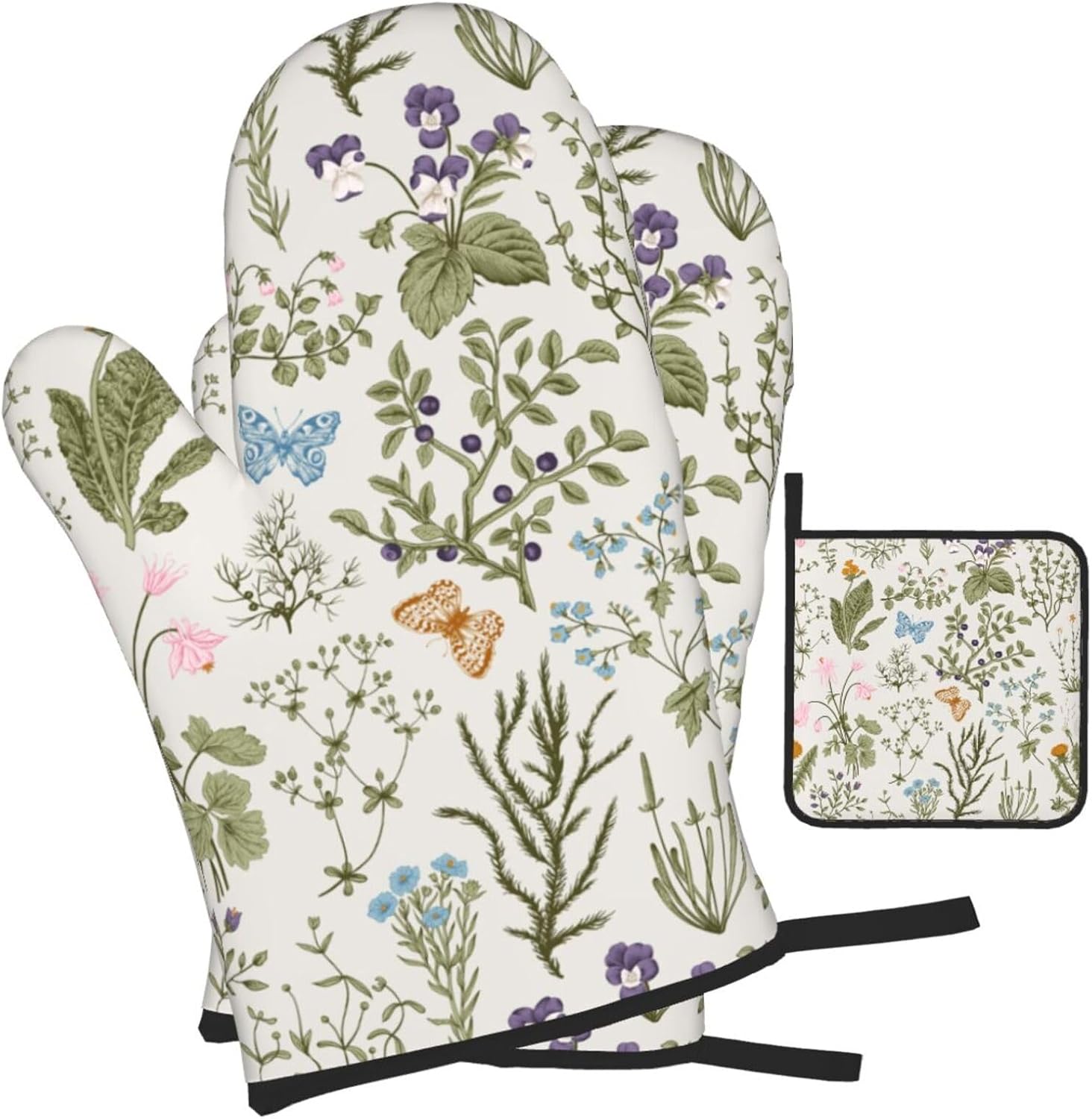 Vintage Floral Oven Mitts and Pot Holders Sets of 3 Cute Botanic Hot Pads Herbs and Wild Flowers Oven Gloves Heat Resistant Washable for Kitchen Cooking Grilling Baking