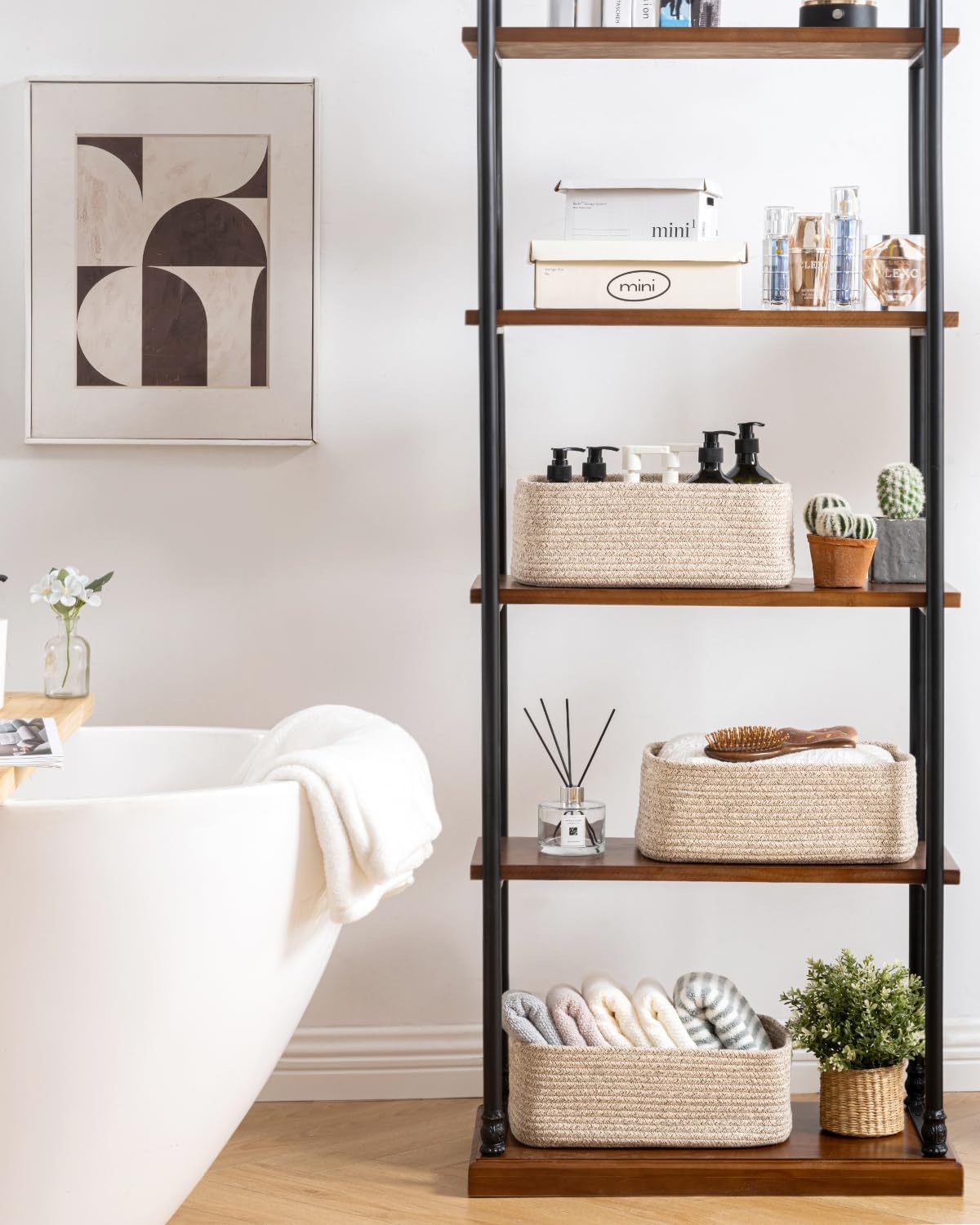 - [ Elegantly Designed to Match Any DΓ©cor ] Our small rope basket creates a minimalist appearance, and it adds a touch of warmth and texture to any room. The classic solid color design ensures seamless integration with your existing aesthetics, complementing any decoration. Perfect as decorative storage baskets for shelves, cabinets, and any open display space, making them a stylish and practical addition to any decor, enhancing the overall aesthetics of your room
