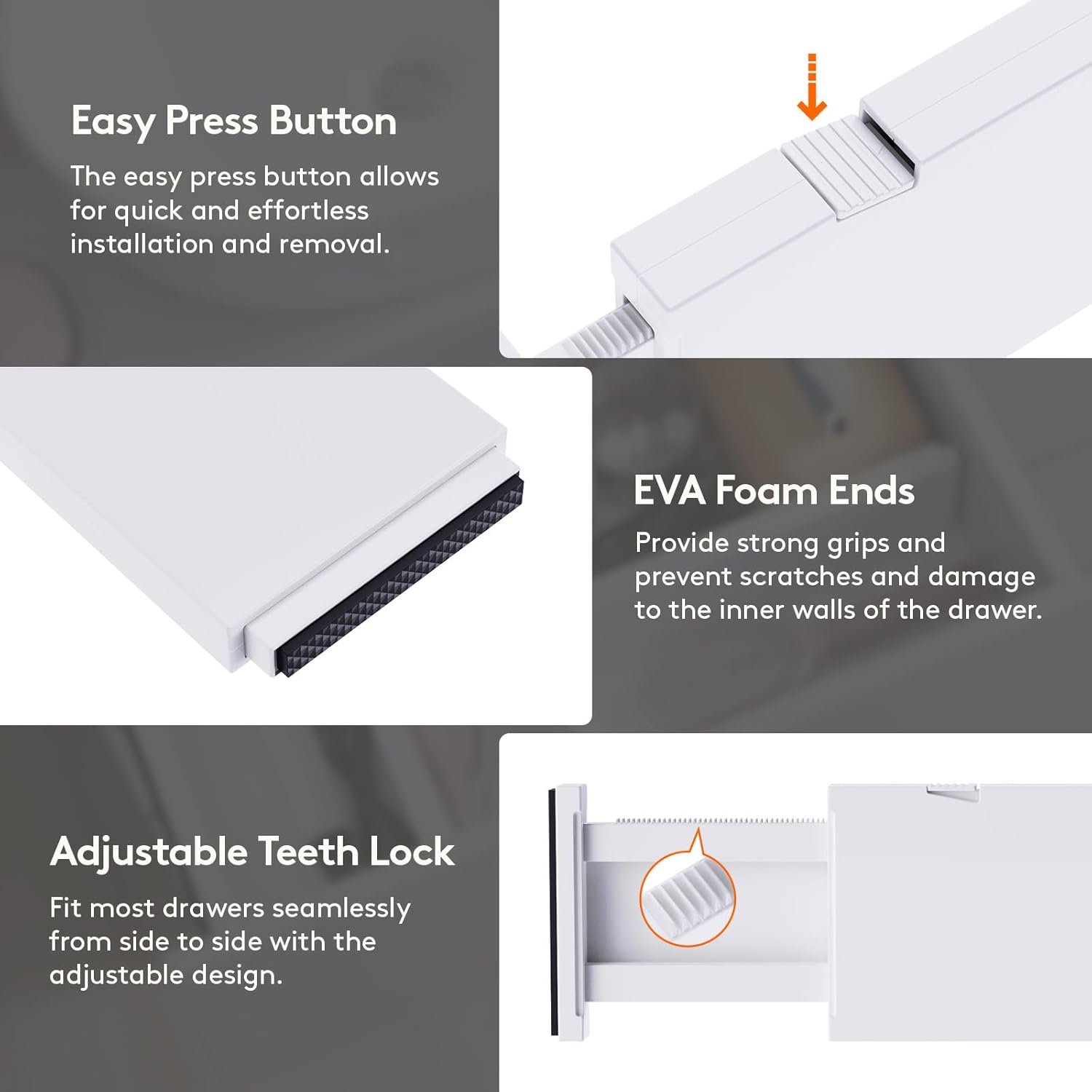 - Premium Material: Our drawer organizers for clothing are made of sturdy ABS material and include high-quality EVA foam sponges on both ends to prevent any scratches or damage to your drawerβs inner walls, leaving no trace or residue behind