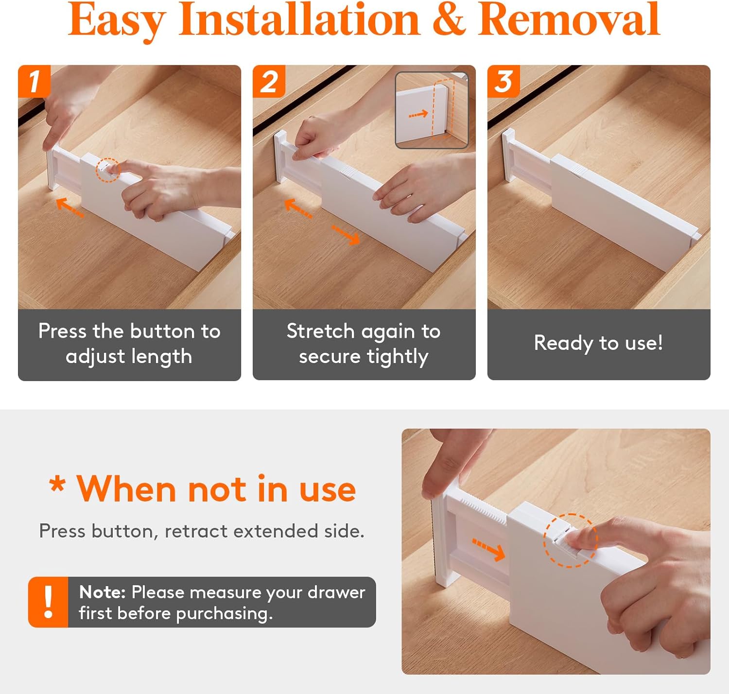 - Easy to Install: Press the top button and stretch to the desired length, then fully extend again to secure in place; The strong spring tension keeps each drawer organizer securely upright; To retract, press the top button and push the stretched side