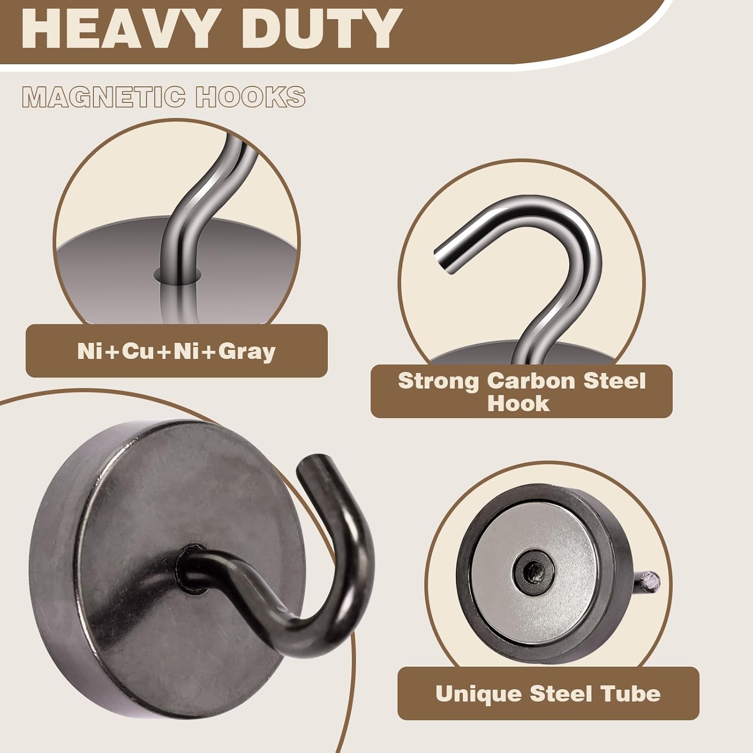 - ✔MAGIC STEEL TUBE DESIGN - Unique design of steel tube inside the base of magnetic hooks greatly increases the attractive force , especially on thin steel! It increase approximately 20% force comparing those none-tube magnets. it solves the problem of weak force on thin steel. Permanent magnetic hook with magic steel tube, strong magnetism lasts forever!